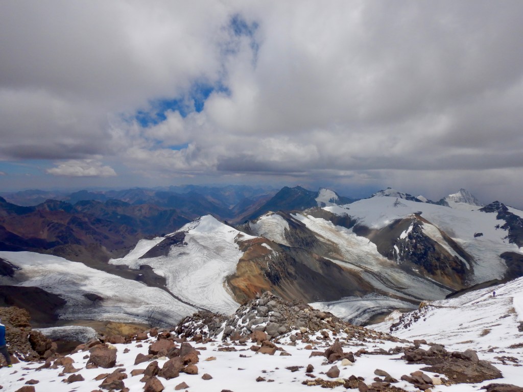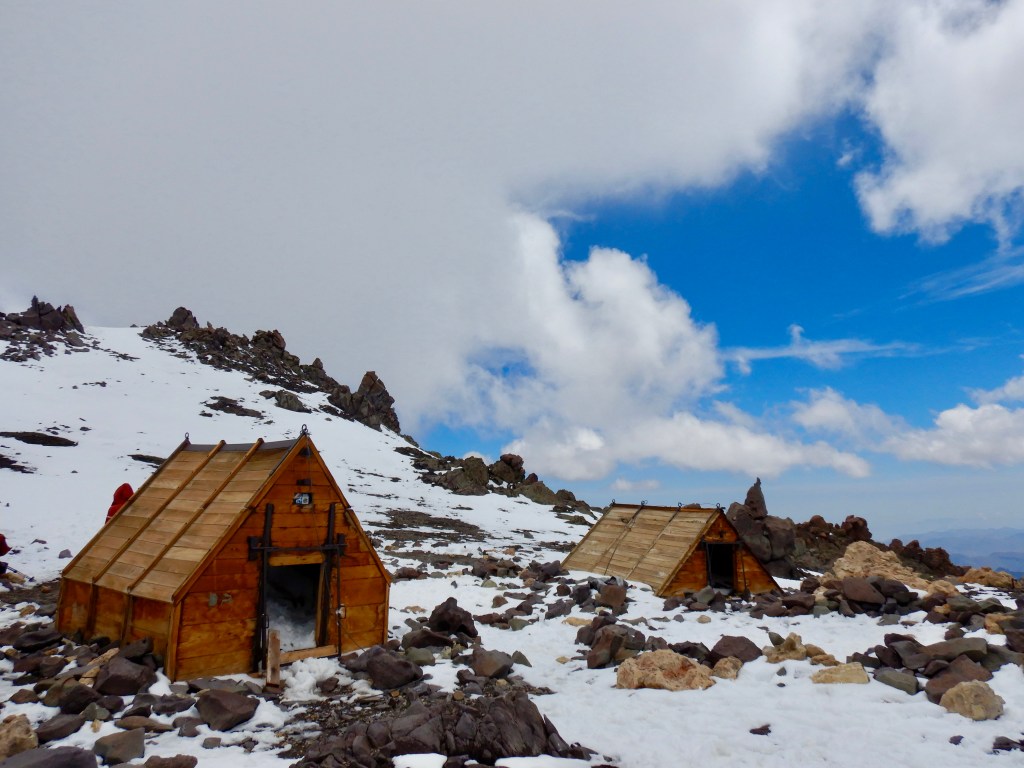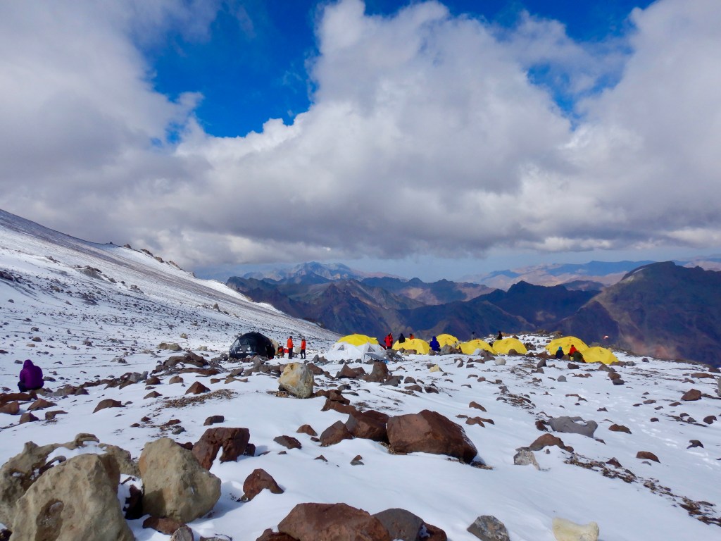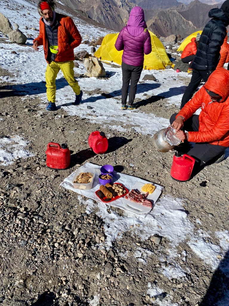 Day 11 – Plaza Canada to Nido de Condores (5560 m, Camp 2). Today we climbed higher once again. With full stomachs we moved up to the second camp with somewhat overcast skies. We made a decision to hire a porter for the two of us to lighten the load and save some energy for the summit day. As the porter would carry 20kgs, our packs were more than manageable as we pushed on. The higher we climbed the more layers we put on. The weather was not cold but also not that warm either. Once we arrived at camp 2, again we all settled into our tents and had dinner served to us. The guides had to make a water run to a near by lake which was a 40-minute round trip.
