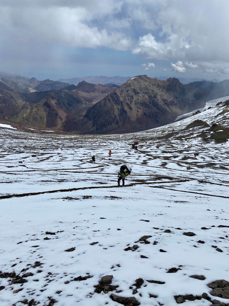 Day 10 – Plaza de Mulas to Plaza Canada (5050 m, Camp 1). The beginning of our summit push. We woke up to some low cloud coverage and a different feel in the air. The weather was a bit stormy, the wind was blowing and the snow was coming down. Unfortunately, one of our team members decided to end his journey here as a family member passed away and he felt the needed to return home. We packed up all our gear from the tents and started our way up the mountain.