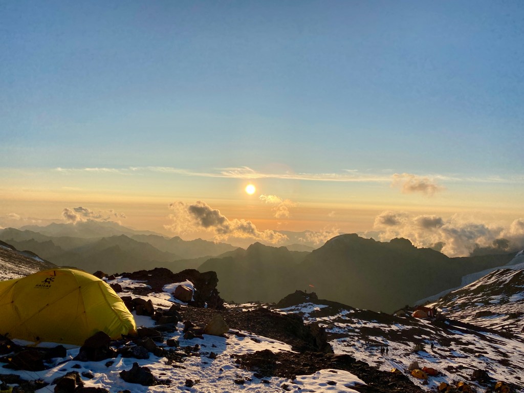 As the afternoon turned to evening, we noticed a continuing trend of an upset stomach sweeping through camp. One of our guides was not feeling all that well and chose to head back to base camp and arrange for another guide to take his place. We gathered together before nightfall to discuss the future days and as the weather was holding constant, we chose to take another rest day here at camp 2 with hopes that stomachs would settle. As evening approached we all found ourselves outside the tents gazing at the at the breathtaking sunsets of westerly mountain.