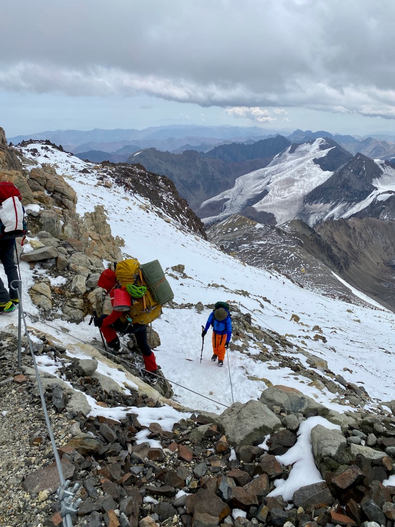 Day 13 – Nido de Condores to Colera (6000 m, Camp 3). This morning drew up some new problems. We were now down another guide as he was not feeling well as well as one member of our climbing team. Two others had a terrible night sleep dealing with headaches and other common high altitude issues. For the previous 12 days we had been climbing in parallel with a second Grajales crew that were having the same issues as us. It was at this point we chose to amalgamate the two teams as both sides had members return to camp. With our gear all packed up and tents collapsed we then moved to the highest camp of the trip. This trek was again, up, up, up. It took us about 3 hours in total with a rest break every 45 minutes. After we passed the abandoned Camp Berlin we were onto the final push with a fixed metal rope to help guide us the final rock and ice steps to camp. As we arrived at the same time as the porters it took a few minutes before we could claim our space and set out our sleeping situations. We tried to help with the camp duties but they had a system and could get everything sorted out efficiently, so we all just sat back and watched.