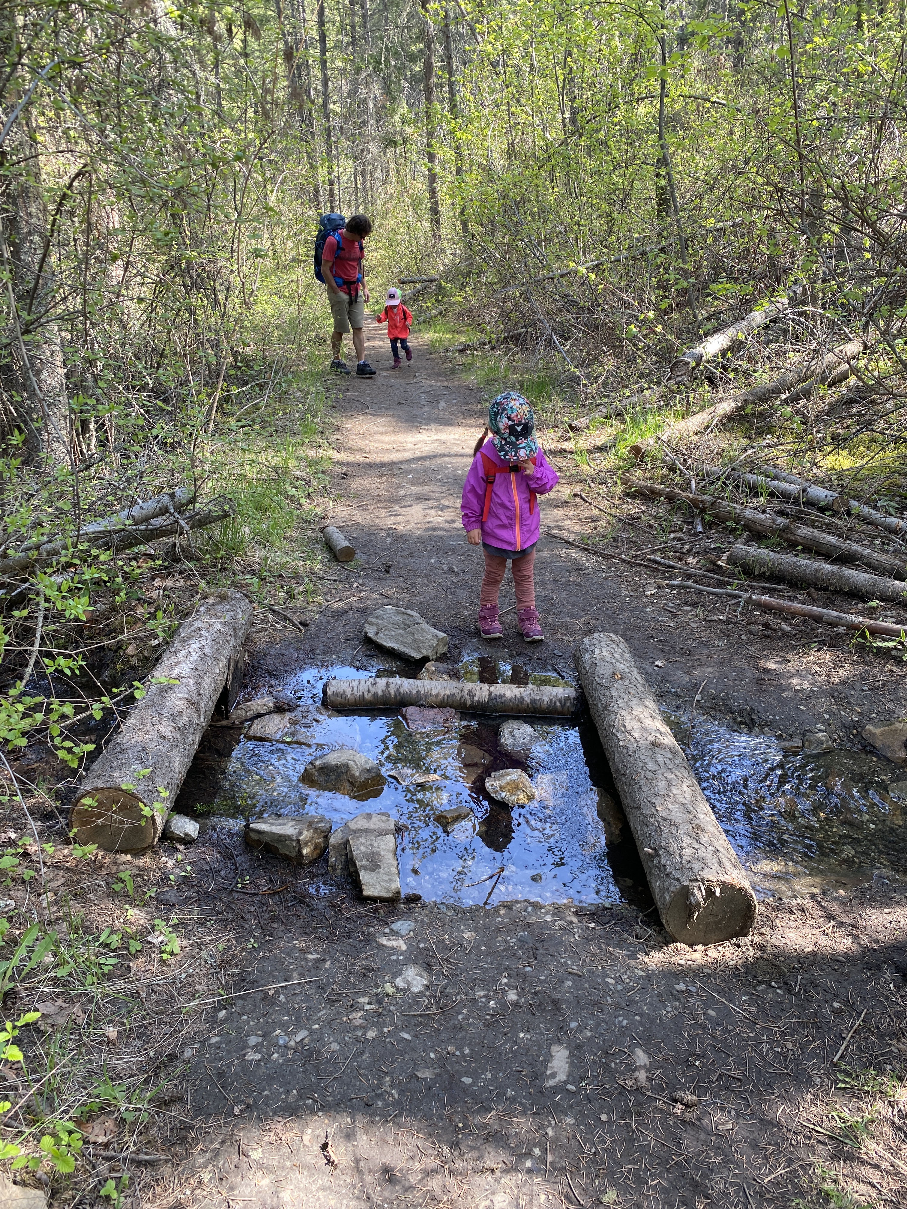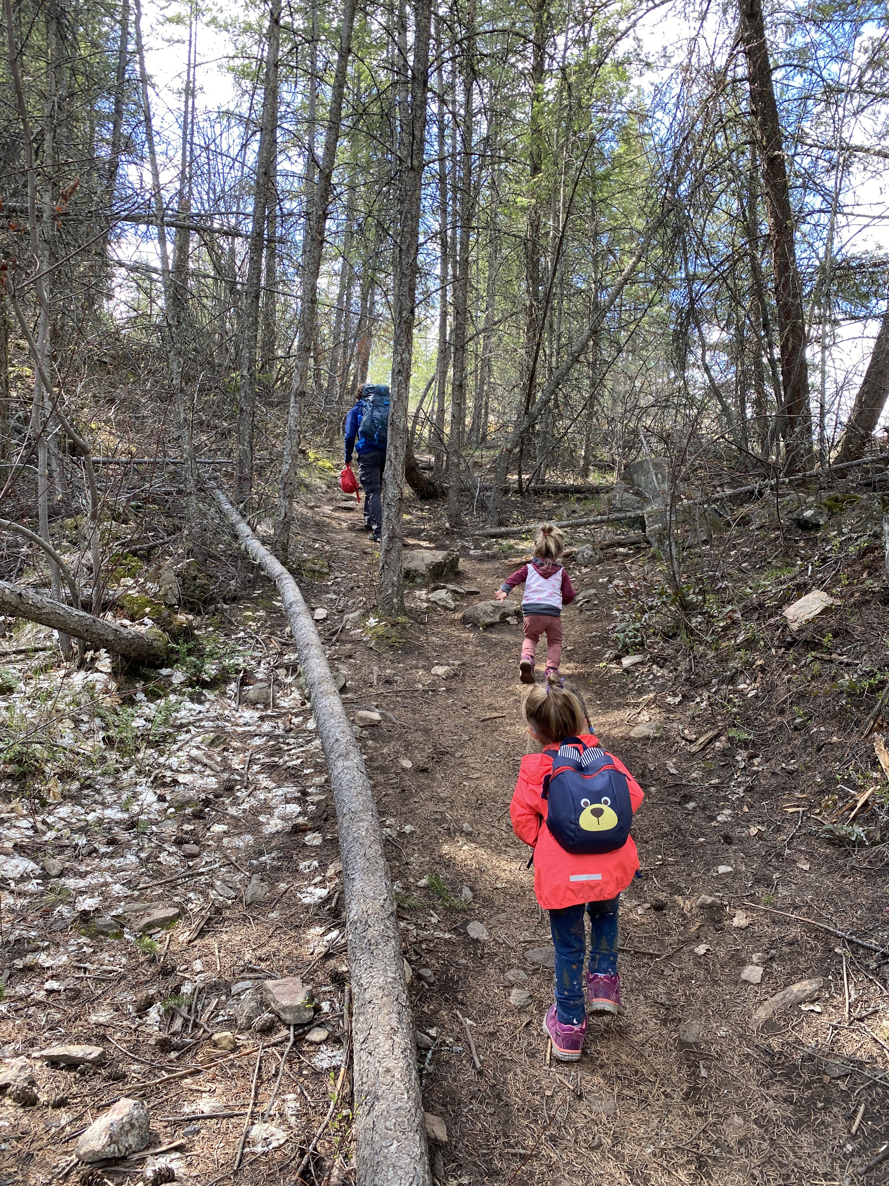 While the girls enjoyed a snack, Tyson looped around with some gear like a rope, some slings and a pair of quick draws to set up a top rope at the far end before repelling down to the starting point. Meanwhile our friends with kids arrived and the girls were easily entertained. This is the same family that hiked with us the Juan de Fuca as well as Twin Lakes in recent years. It was only around 7℃ but the sun was shining and it felt warm. There was a cool breeze blowing up the canyon and oddly it even started snowing for a little bit. All the older kids had a try at the rock face and the girls were excited yet shy to try it for themselves. Watching the others was a confidence boost for them so we took the opportunity to tie them into the rope.