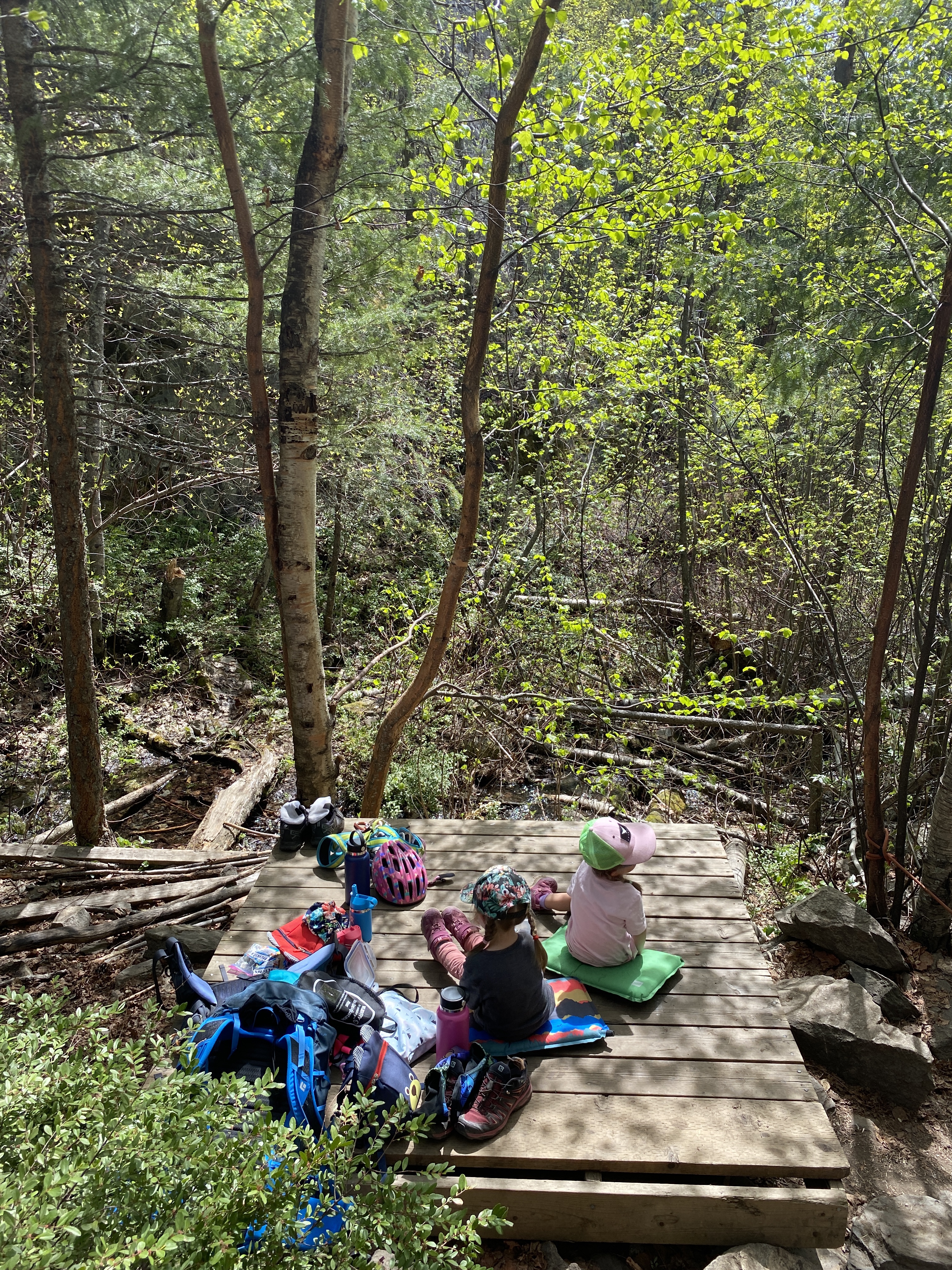 Upon arrival we noticed a group of climbers with multiple ropes across the rock face. There was a nice little wooden platform that we quickly claimed for our gear and lunch spot.
