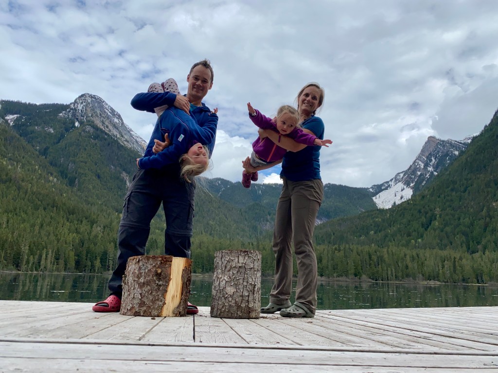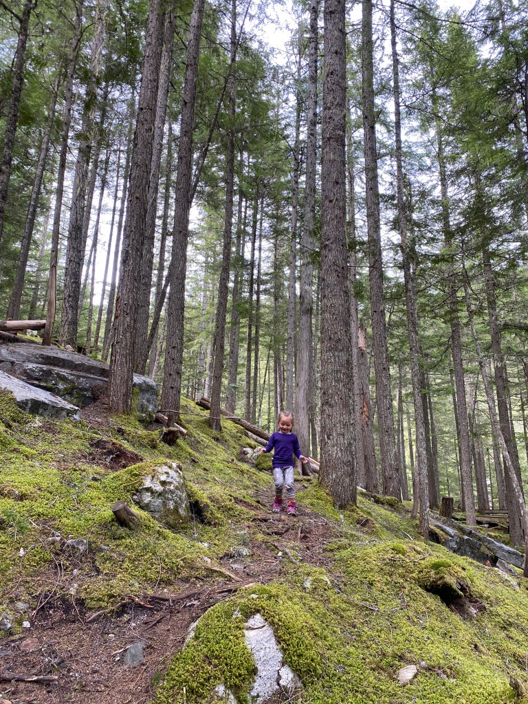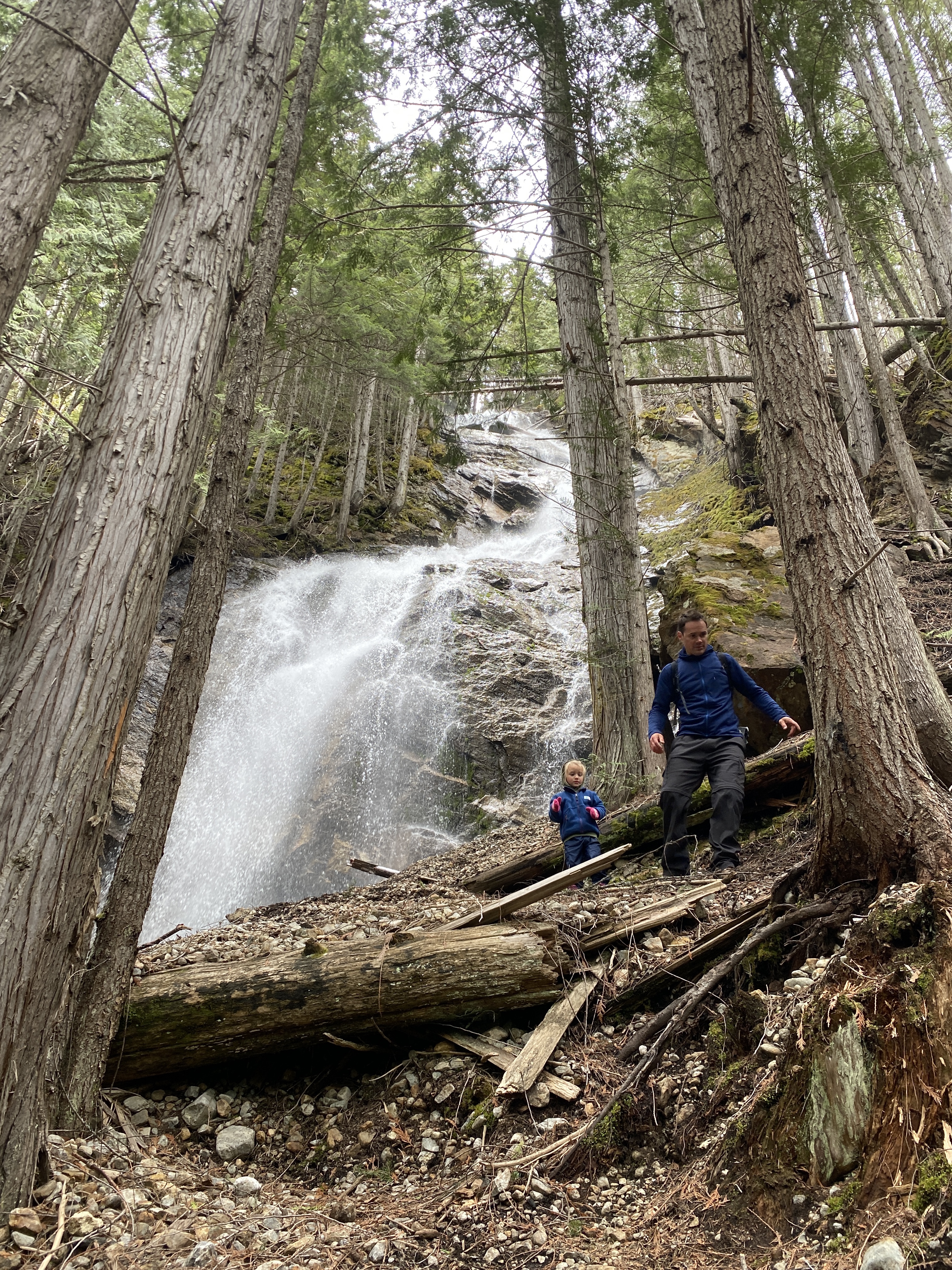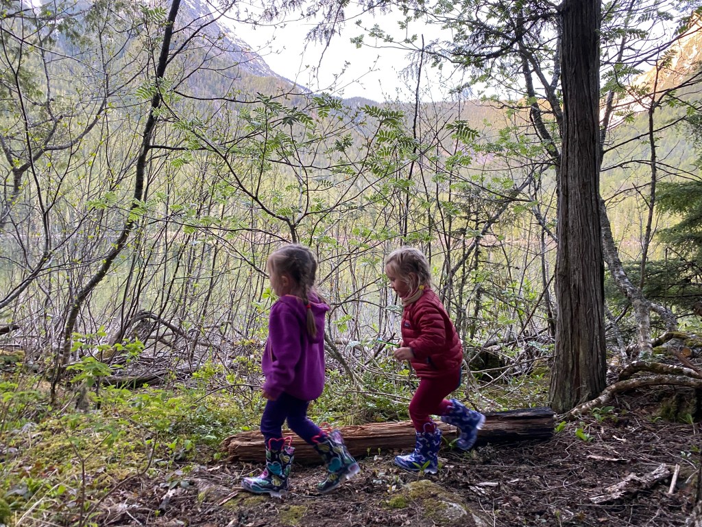 As morning broke we enjoyed breakfast and hot drinks as we smelled the crisp mountain air. Today’s adventure would have us on a day hike part way around the lake. As we approached the source of Spectrum creek we had to forge our way across a log jam in order to gain the opposite side. I shimmied across the log first to make sure it was safe for the girls to attempt to cross, then returned back to assist Bexley over while Shannon held Lidija’s hand as she insisted on doing it herself. From here was a loosely marked trail that climbed its way through the cedars and terminated at an unnamed waterfall on an unnamed creek. This made for a 2 km round trip adventure to the perfect lunch spot and created an opportunity for the kids to rest their legs.