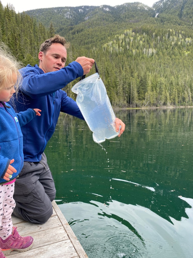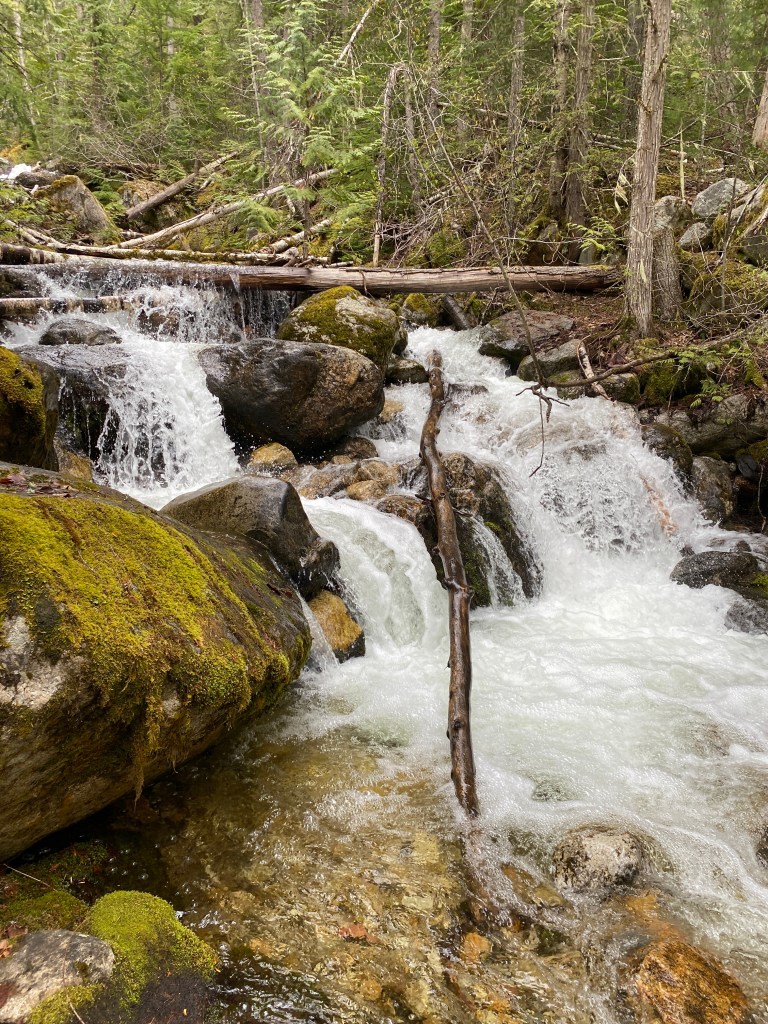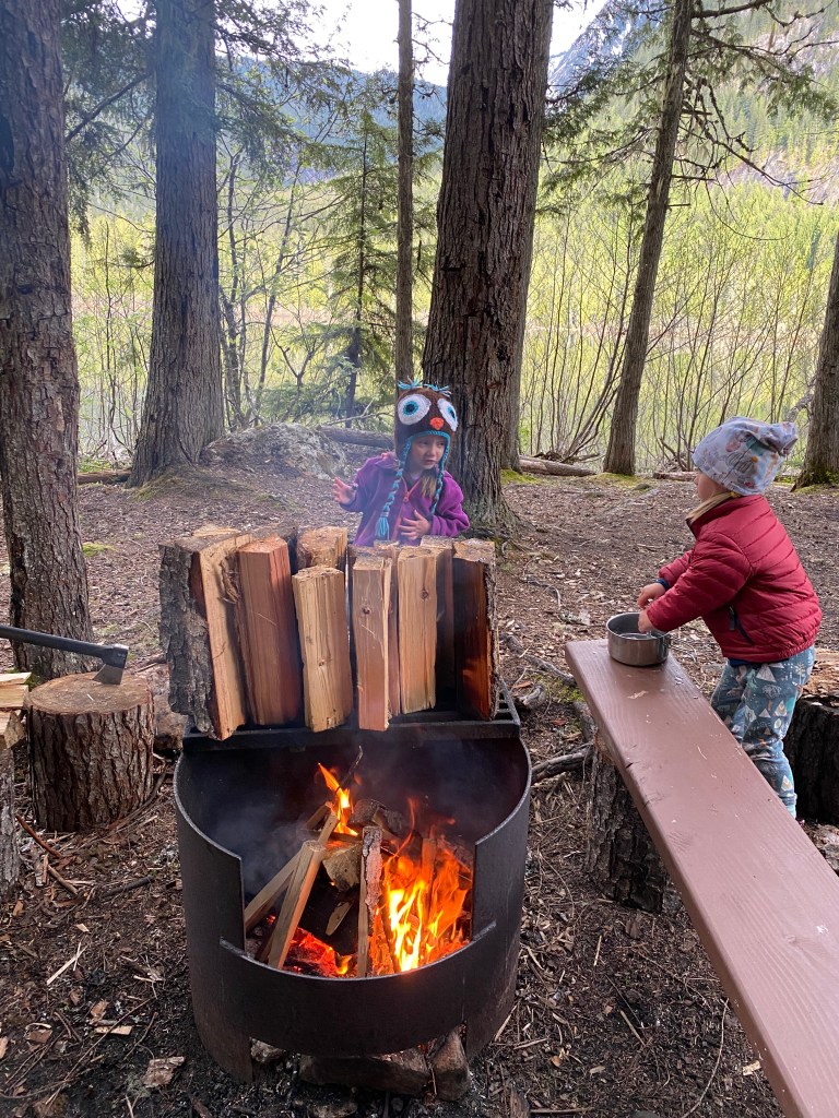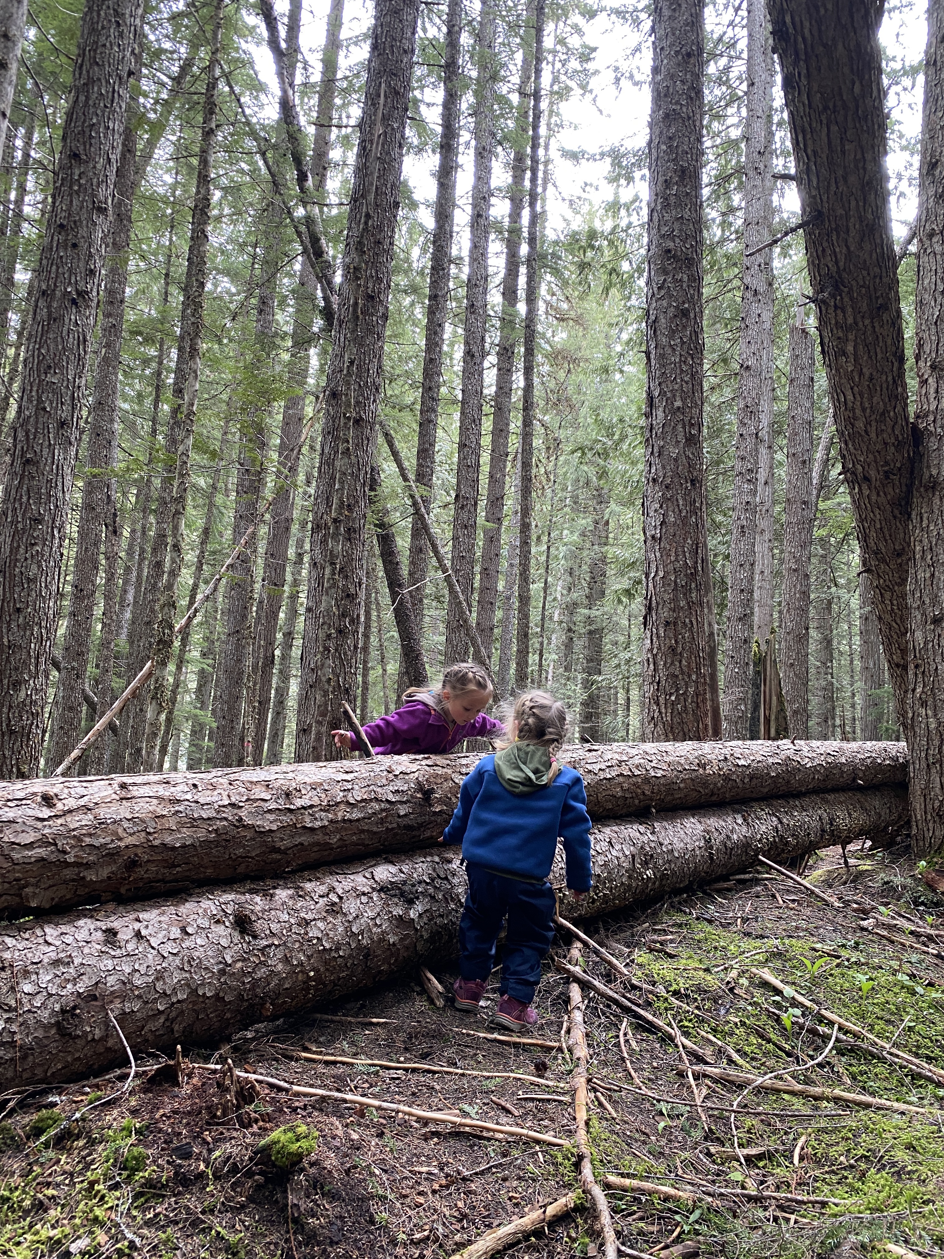 As morning broke we enjoyed breakfast and hot drinks as we smelled the crisp mountain air. Today’s adventure would have us on a day hike part way around the lake. As we approached the source of Spectrum creek we had to forge our way across a log jam in order to gain the opposite side. I shimmied across the log first to make sure it was safe for the girls to attempt to cross, then returned back to assist Bexley over while Shannon held Lidija’s hand as she insisted on doing it herself. From here was a loosely marked trail that climbed its way through the cedars and terminated at an unnamed waterfall on an unnamed creek. This made for a 2 km round trip adventure to the perfect lunch spot and created an opportunity for the kids to rest their legs.