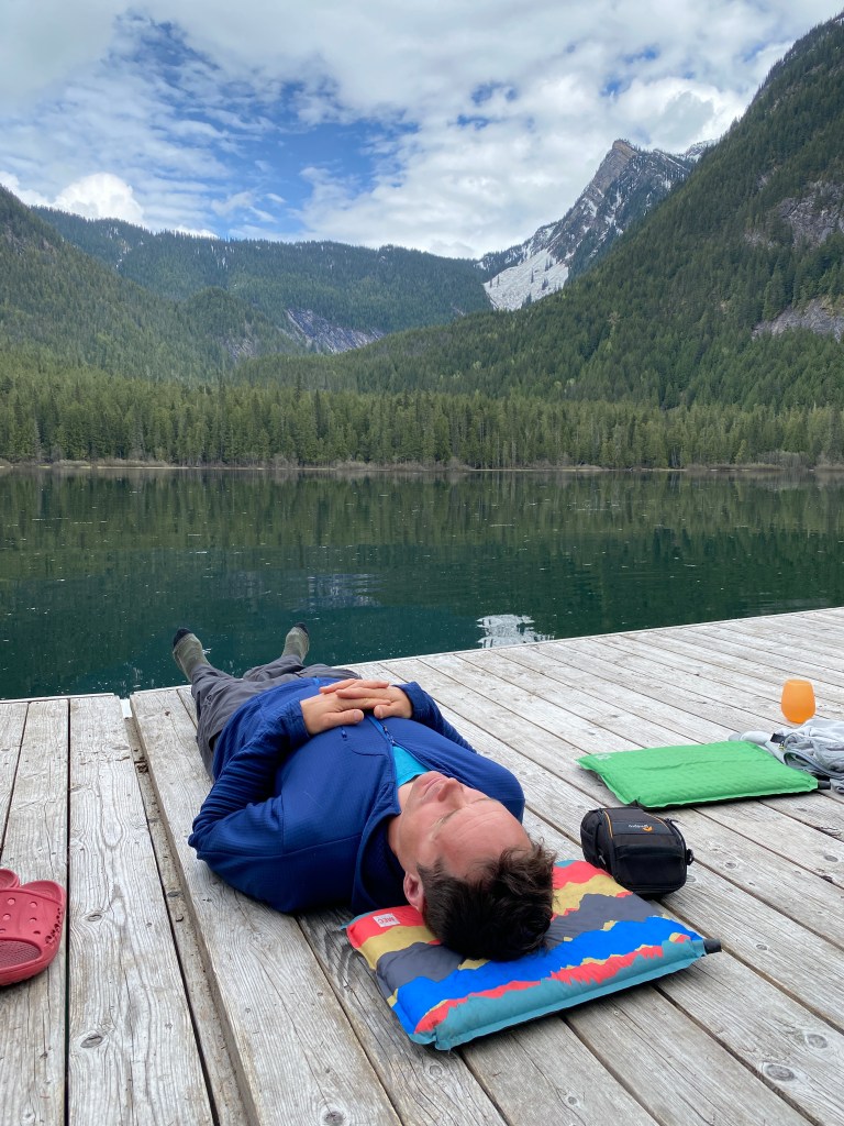 After an easy six kilometre hike through the cedar and pine forests we descended down to the shores of Spectrum Lake. This backcountry location is amazing for both new and experienced adventurers. The area is equipped with wooden tent pads, fire rings, picnic tables, four post shelters, bear poles, stocked outhouses, a park ranger cabin and even a floating dock; more of a backcountry glamping trip than forging the elements. Because this lake also sits at a lower elevation it is the perfect early season trip as well. After setting up the tent and acquainting ourselves with the surroundings we were ready to put our feet up and enjoy nature at its finest.