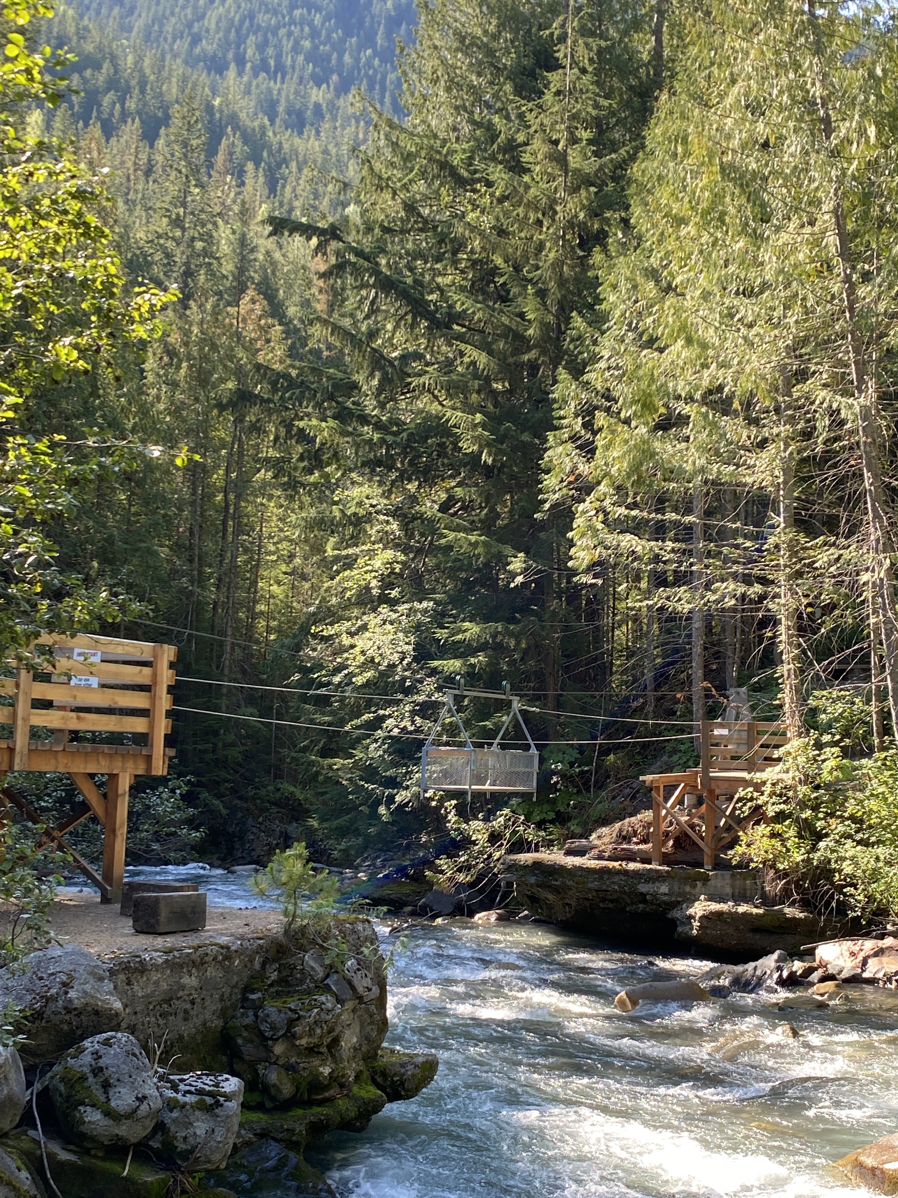 This trail has been on our minds for a few years now. The full length consists of a 13 km historic railway line from Rosebery to Three Forks in the West Kootenays. We were about to hike a section a couple years back before when we realized the cable car was removed and needed to be fixed. Fast forward a bit and the day finally came. We were in the area, and the trail was in perfect condition with the newly reconstructed cable car. We parked just off Highway 31A turnoff towards Sandon (Three Forks) in an upper parking lot then walked down the road around 30 metres before reaching a large wooden gateway and the start of the trailhead.