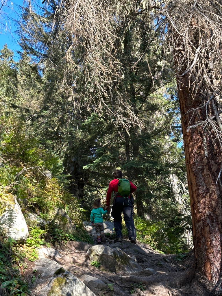 We left our home around 7:30 am and arrived at the trailhead ready to hike by 10:30 am. It was a crisp fall morning and +7°C starting out. The girls had their puffy jackets on along with their merino wool mittens. The hike started hard and fast with switchbacks in the trees.