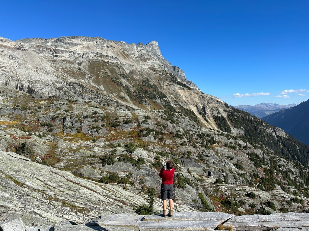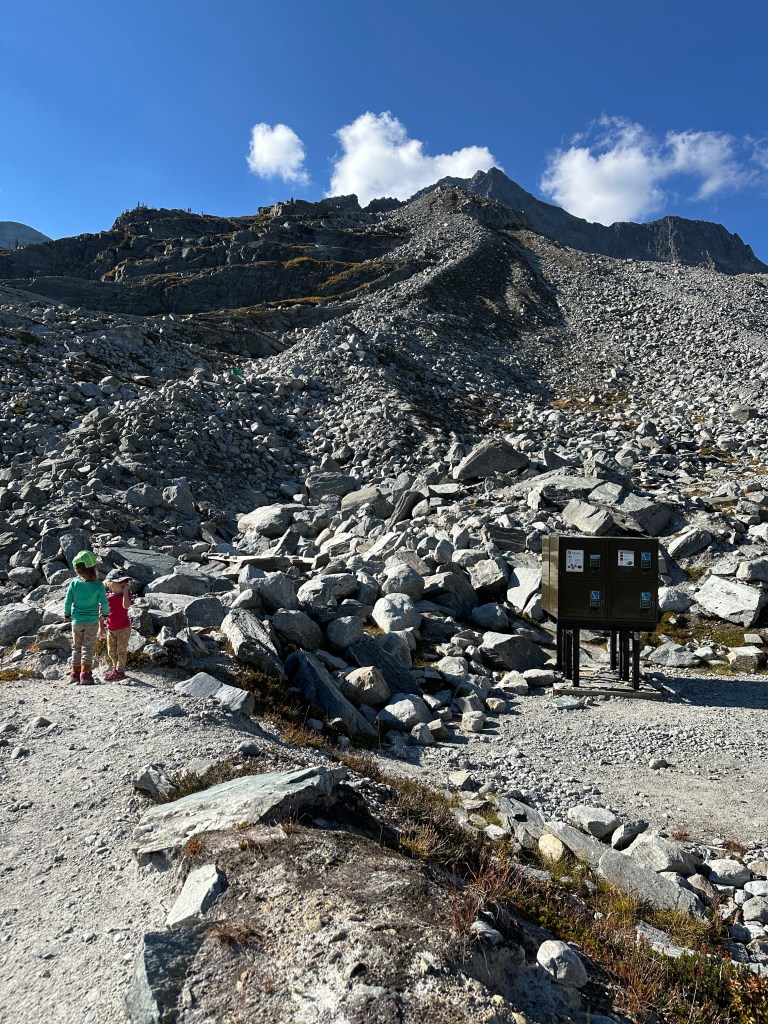 There is an 8-pad campground along with bear caches, a grey water dump and a fly out throne toilet. Someone had even balanced together a makeshift picnic table out of big boulders and wood. Hiking this trail in the fall results in less crowds, crisp mountain air, and breathtaking fall colours from every point on the spectrum.