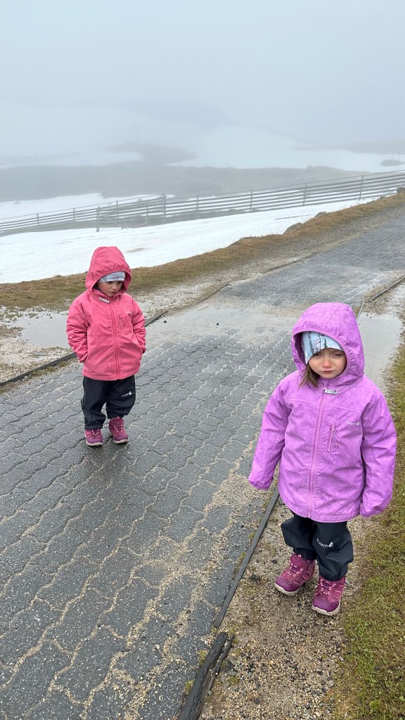 A couple more kilometres in and everything was completely covered in the winter snowpack. There were however 8′ tall wooded posts attached to the walkway for the length of the hike so we just continued to connect the dots above the walkway with snowshoes in place. There were also footprints of two others from that day ahead of us that topped up our confidence. We could however not see much more than one post ahead of us before the white out conditions took over. By 12:00 noon we had reached Rawson’s Pass at 2124m above sea level. From here the summit is just 500m as the crow flies and the rock outcrop in the high alpine stands tall with the remaining Snowy Mountain Range in the background. From here, if you could see the walkway, it should be another 1.67 km. This was not however what we were looking at. We just saw white as the cold wind blew into our face. We also noticed that the wooded posts were no longer present. There were however two other snowshoe tracks leading off into the fog. 10 minutes into following the tracks we noticed who was making them and they were getting closer and closer to us. We soon found out that they had turned around just a short distance ahead as the trail was not visible, whiteout conditions and the winds were excessive. Shannon and I now had a decision to make. Do we push on and inch forward looking for any sign of unknown trail markers with two four year olds hiding inside our jackets to keep warm or should we play it safe and return to the chairlift with plans of summiting the peak at a later date?