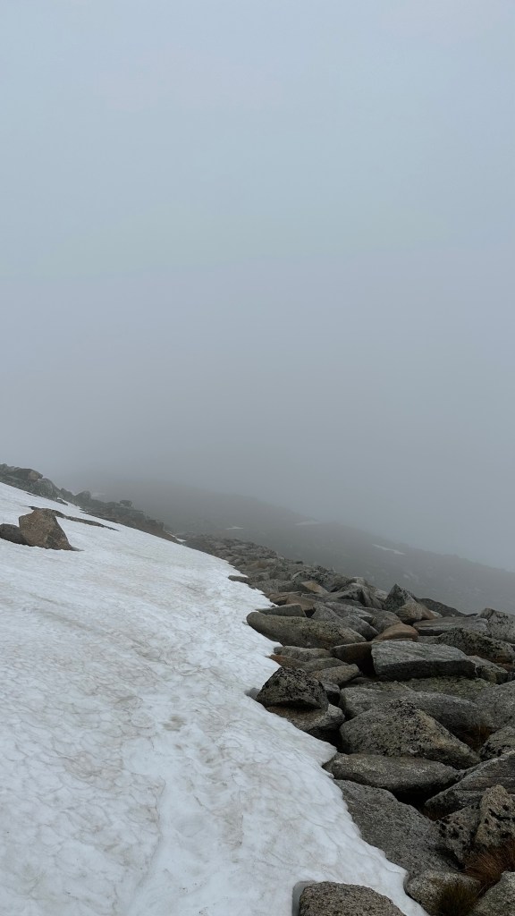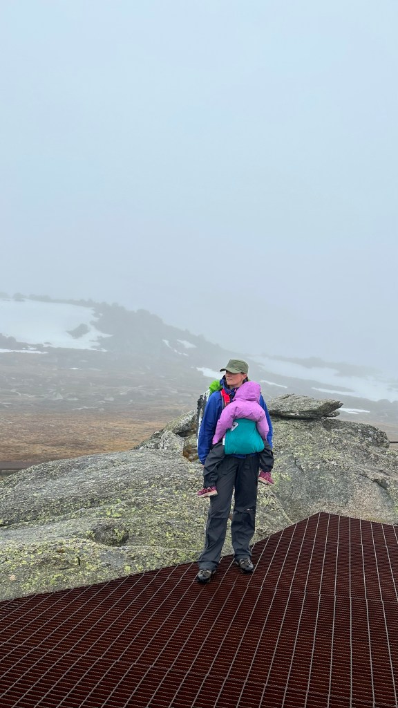 This hike in the summer months seems quite pleasant. It is a combination of paving stones and elevated steel walk ways from the lift to the summit and even host-guided sunset and stargazing tours are offered. Long sleeve jacks and suncream is recommended as the high alpine can get cool but can be quite sunny. Today however was different than the brochures, very different. Conditions at the top of the chair were similar to the bottom, fog and rain and cold. Visibility was drastically limited and having the chairlift final ride being 3:45 pm we decided to have a turn around time of 1:00 pm. Our two girls seemed to enjoy the chairlift but eventually grew cold and wanted nothing to do with the weather, this included walking in it. They were now in the Trail Majik carriers and we knew it would be that way for the duration of the hike. It was now 10:15 am and we were just starting out. With 13km round trip, 300m elevation gain and around 50lbs of extra weight we were a little concerned about our time. After a couple hundred meters in the misting rain we came across a few snow patches. No big concern here. A couple hundred more, the patches grew. 1.5kms in we come across the Lookout. We could see nothing more than a thick combination of white fog meeting white snow with a few rocks piercing through.