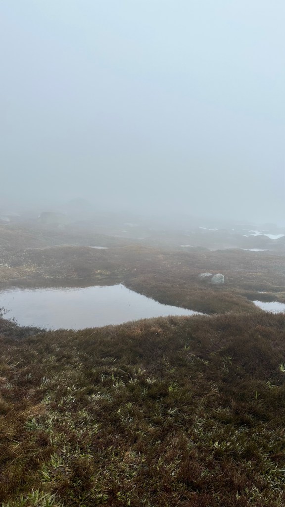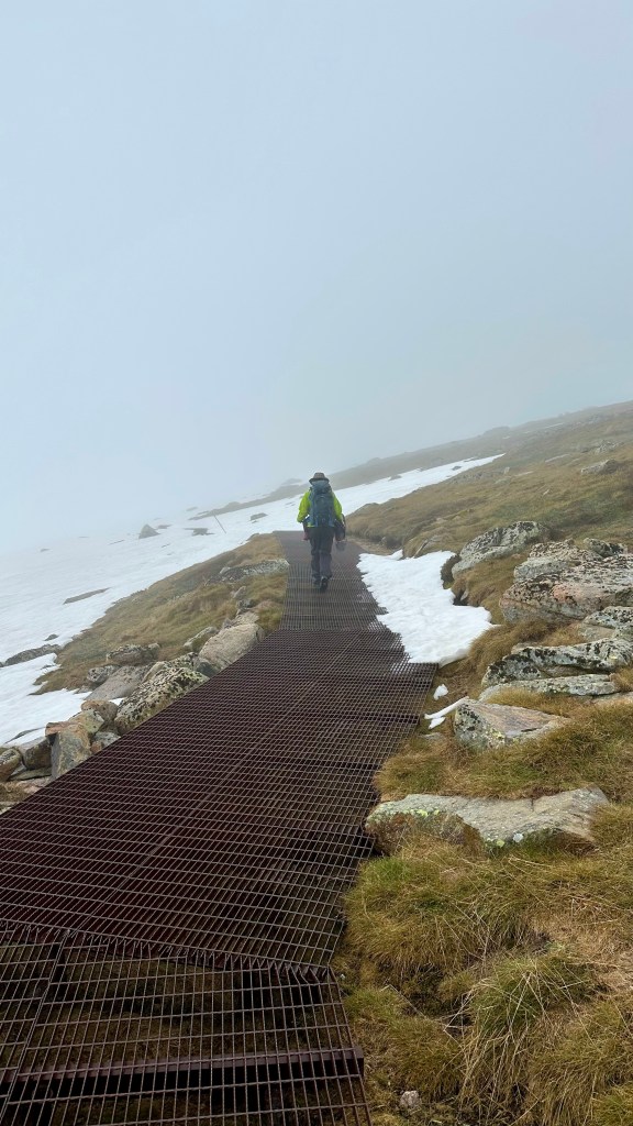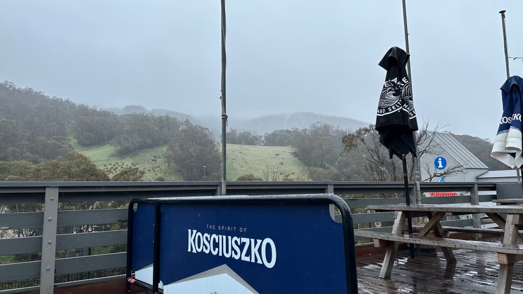The alarms rang at 7:00 am as the four of us watched the rain and fog cover the mountain side across the way. After returning from our complimentary breakfast upstairs we committed to our plans, drove the half kilometre and parked the car for the day. When we arrived at the chairlift ticket counter we couldn’t help but notice the lift was not operating. Not only that but the lift didn’t actually have any chairs on it. We quickly learned that the Kosciuszko Express chairlift to the top was under maintenance and the Snowgums Chairlift that drops you off 90 meters lower was in its place. After chatting with the ticket lady and purchasing our passes we made a quick stop at the rental shop to pick up some snowshoes for the pair of us, as they were strongly suggested.
