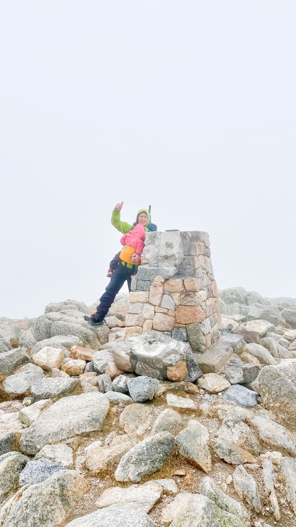 With no blowing snow I knew we could find our way out with our tracks but here’s hoping that the people days before knew where they were going. I was now 30m ahead of Shannon and looking back at her she was starting to fad into the background. Looking forward I could see a rock outcrop with a rock painted orange next to a 3m wide flat rock path. I waved Shannon on and we soon took shelter from the wind to regroup. The girls are unhappy now, everyone was hungry and we had to be only a few minutes from the top. We followed this path up and around the mountain in a counter clockwise way and popped back out in the blinding whiteout and fierce winds. We staggered our way through the open white, looking for anything. Off to our left however we notice a stone pile cemented together that looks like some of the summer photos we had seen in the past. 30 steps later our hands were all over the peak. The time was now 12:45 pm.