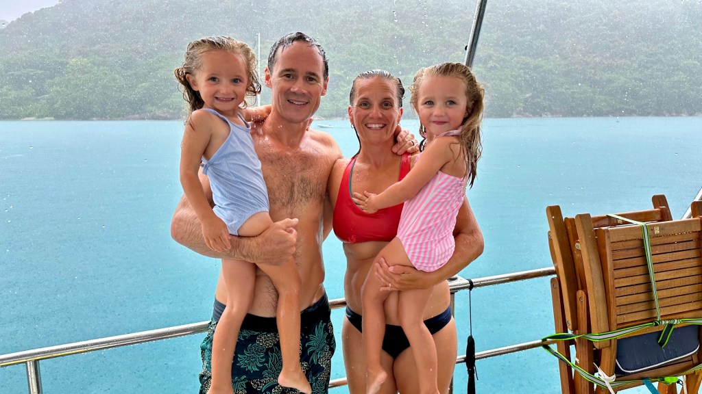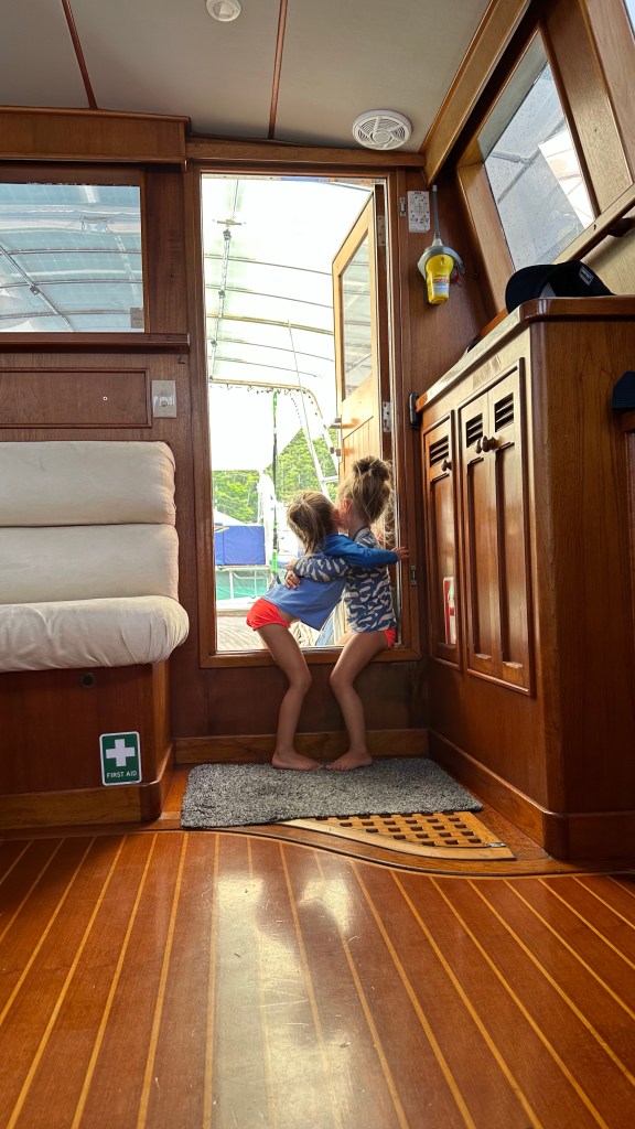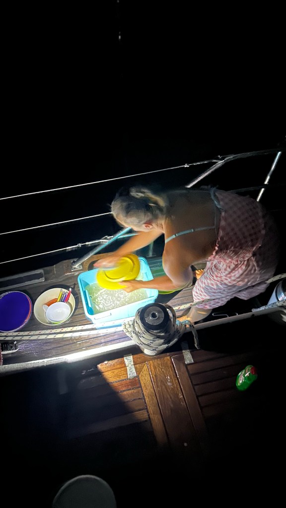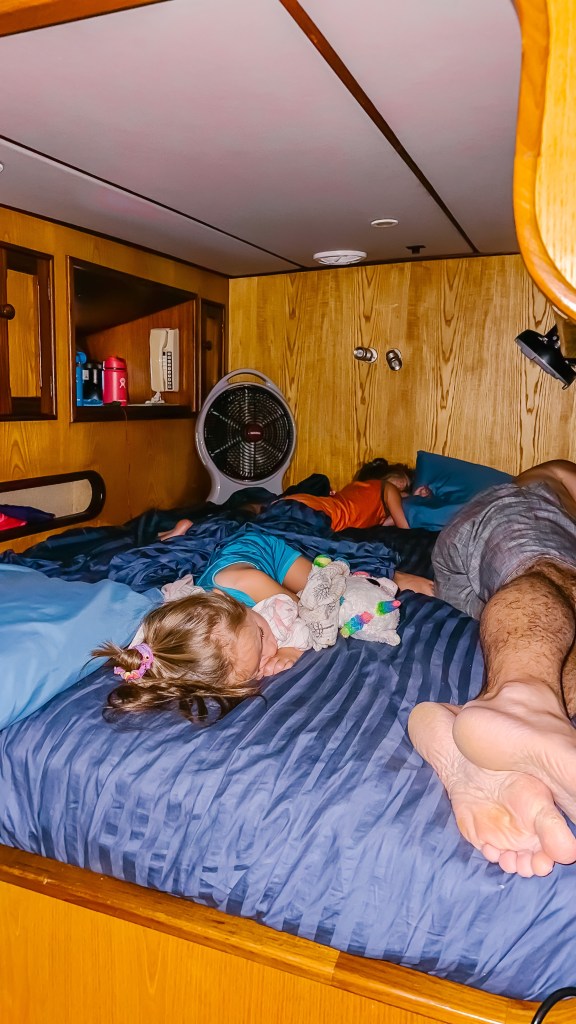 After dinner on the deck we all settled down for a good nights sleep. With high humidity and day time temperatures into the low thirties, the evening 20°C degree temperatures make for a pleasant relief. This provoked problem number two. With little air circulation and the kitchen/galley well below deck, the sleeping conditions were challenging. Tyson actually spent the night outside as the cabin heat was leaving him a hot sweaty mess. Problem three arose around 4 am as the house battery was dead. This left the boat with no electricity, not even the mast anchor light to let others know our location in the dark. It also meant no fans in each of our sleeping cabins, which made them heat up quick. I was left with the solution of hauling the girls up out on the main deck to continue their sleep.