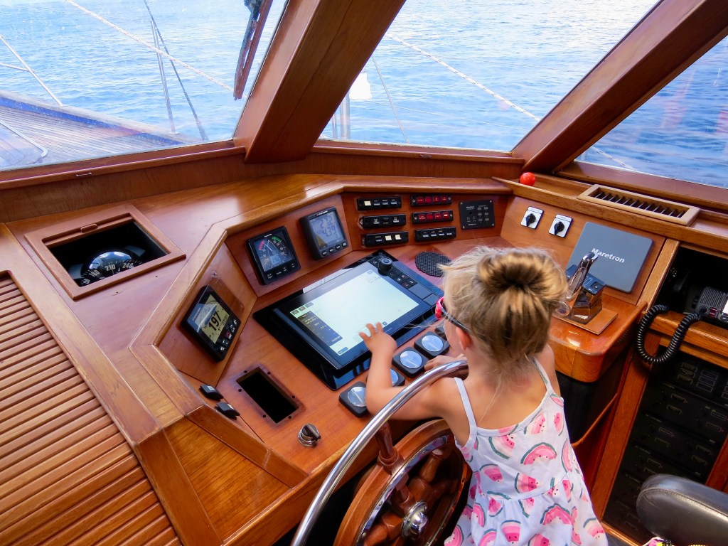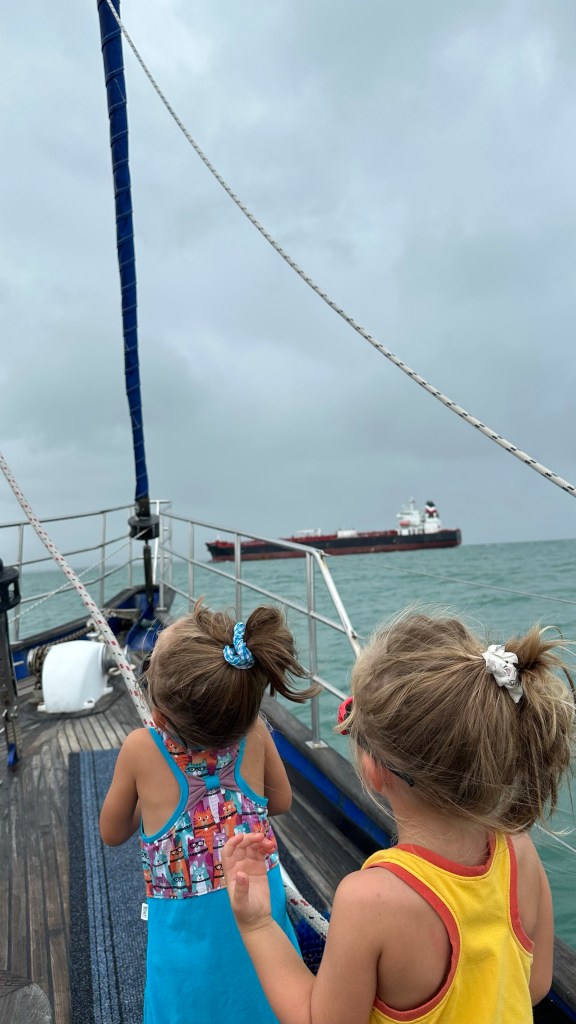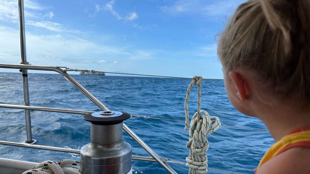 Unlike driving a vehicle, while sailing it is not uncommon to keep on the move throughout the night. The sailing yacht is equipped with full navigation equipment along with sonar for the weather and GPS autopilot. While the crew members roll around in their cabin bunks, one member stays awake and keeps watch for anything that may surface over the horizon. Because of the heat, putting the girls to bed at night consisted of Tyson and I cradling them to sleep on the outside deck while they drifted off to dreamland. We would them move them below deck and into bed. The nights this time of the year traditionally consist of overcast skies and rain and that is what we got. Tyson pulled the first shift from 9 pm or so until just after midnight. With no excitement other than a couple parked cargo ships and winds that pushed us between 3 and 6 knots, the night was fairly smooth. Just before 4 am however things took a bit of a turn. We woke up to the beeping sound of the autopilot displaying that there was not enough battery power to operate. The captain was now steering the boat through the black rainy skies. Around 4 am we had now lost all power completely. This resulted in total darkness. Nothing on the boat was operational now, no fridges or freezers, no flushing toilets, mast lights were dark and all display screens were out. The captain was now relying off the last bit of displays he recalled before we went dark. The one main thing we did remember was that we just happened to be crossing a cargo ship shipping lane 10 kms wide and that we were only 1/3rd of the way across. There was also not one but two 200 m boats coming up behind us somewhere in the dark with no way for them to see us and our nearly deflated sails in the 3 knot winds. We tried to start the engines to get things back on line and charging but things fell short. Something must have been plugging the fuel lines as the engine would only run for a matter of minutes before sputtering out and leaving us in silence. With our course now changed we took ourselves out of harms way of the massive ships, and by 5 am the sun was starting to rise and bring some comfort to our situation.