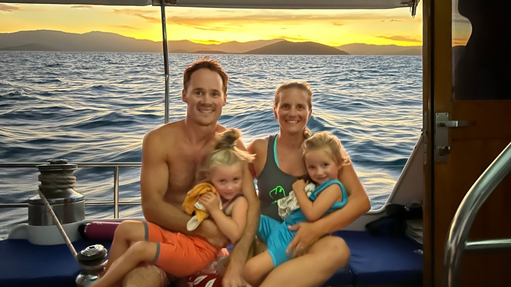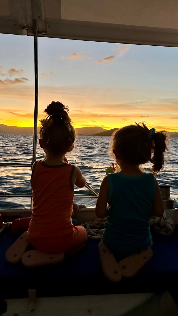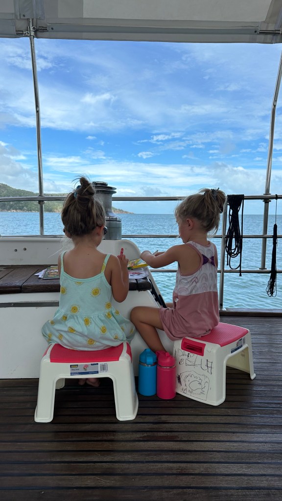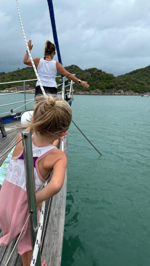 The day finally arrived for us to leave the marina we called home for the last 6 whole weeks. The excitement in the girls was unreal. They had been waiting for this day for months, asking us daily since we got here when we would sail. After stocking up on food and any last minute supplies the 6 person crew (including our two girls) and the captain lifted the ropes and motored between the channel markers out to open waters. With sails up we set our bearings east towards the Whitsunday Islands. There was a strong wind heading due north so we tucked in along the north coast between Hayman and Hook Island. After close to 3 hours under sail we tied onto a mooring ball and called day one a success. The only troubles were that the front genoa sail would not unfurl.
