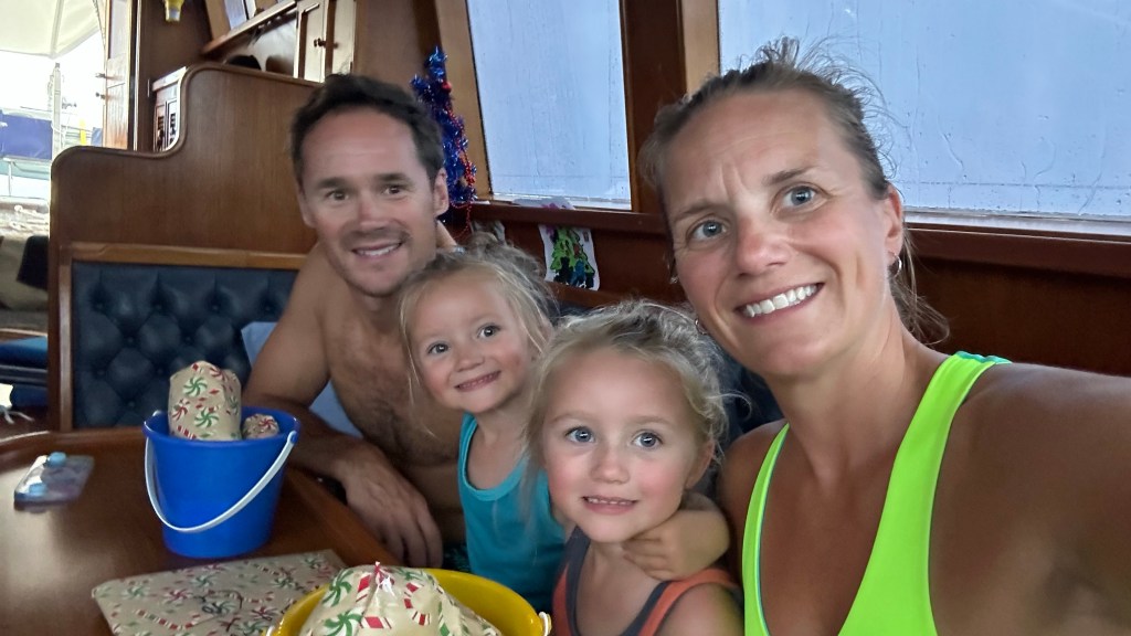 Once we were out of the bay we soon realized that there was basically zero wind. This was not much of a concern at this point in time for having the motor running would also top up the battery bank as the clouds had now built up thick and were doing nothing for our solar array. After a half day at sea, with confidence low and rain falling hard we all gathered together around the upper saloon table to enjoy a delicious Christmas dinner with our boat family and friends. By 9 pm people were starting to slip back into their cabin or any cool place they could find for the night and prepare for their night watch shift.