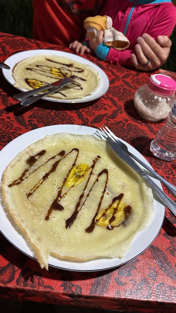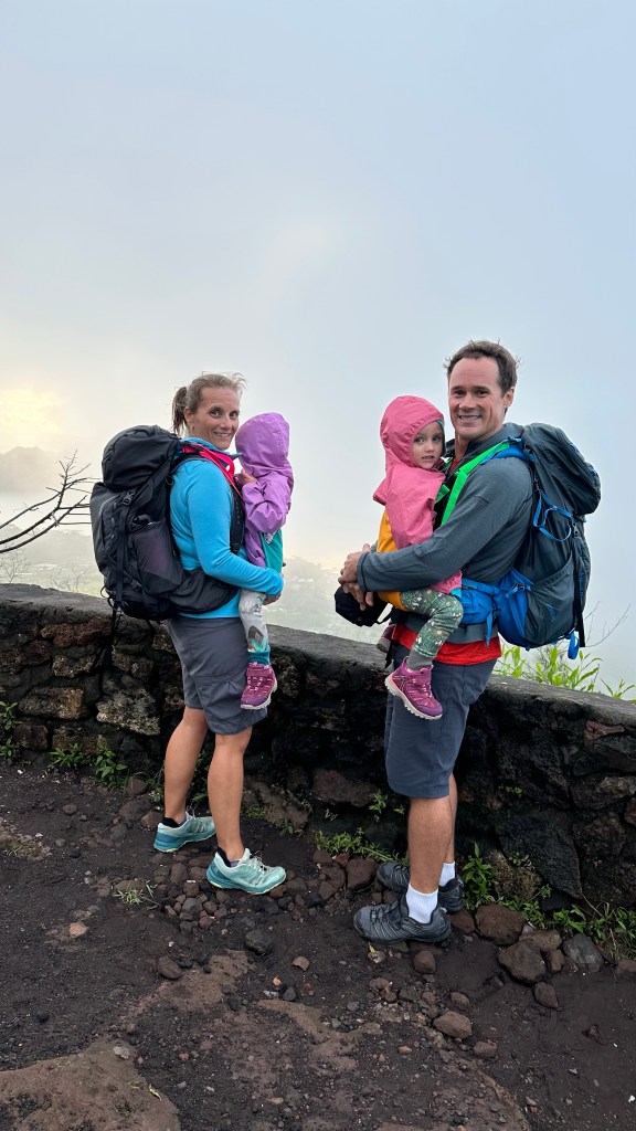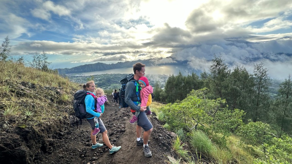 Our alarm rang just before 2:00 am for what others called a bad idea. We chose to do the sunrise hike up Mount Batur with our two 4-year-old girls, in the rainy season. What could go wrong? After a 30-minute drive, stop for pancake and tea, then another 20-minute drive we were ready to start our way up the mountain.