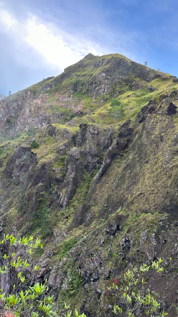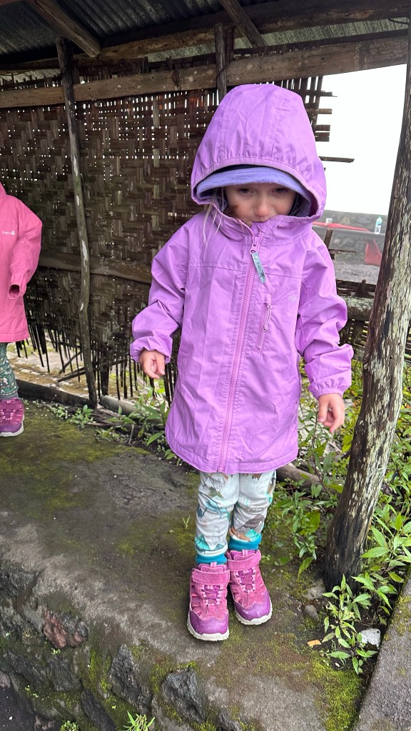 We reached a shelter just before sunrise and the true summit was no where to be seen. Our guide took us over to some benches and mentioned that if we wanted to see anything here was the best place to do that. With our shirts wet from sweat we all donned our warm shirts, with their ThermKids wind/rain jackets for the girls. We were served hard boiled eggs and bananas as the morning got brighter and soon enough we realizing we were looking down onto cloud cover. Maybe a mountain sunrise in the rainy season is really grasping at straws. We did have a few clearings where we could gaze onto Lake Batur and the fields below, but those didn’t last long.