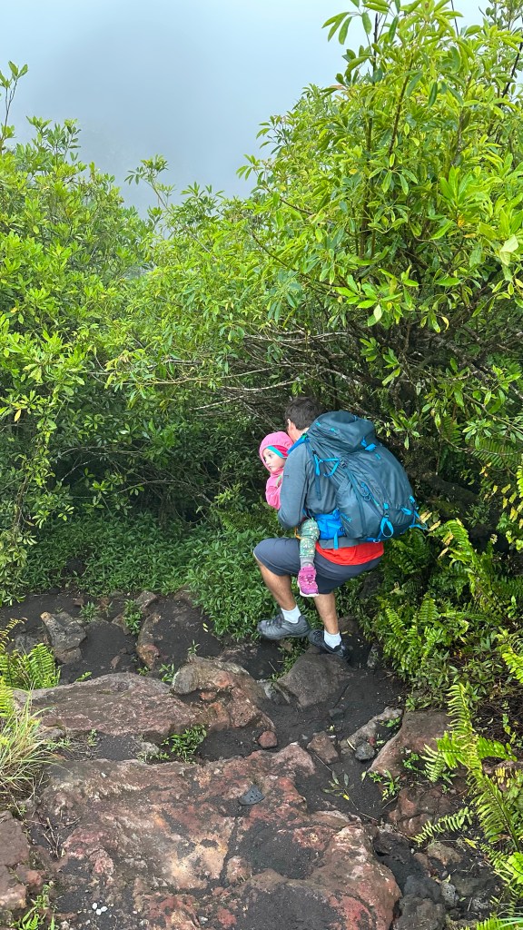 After 15 minutes Bexley had enough and wanted to be carried, not to mention her headlamp tension clamp broke resulting in it sliding off her head so she couldn’t even see her feet in the dark. Up she went on Tyson’s shoulders and we continued on. We joined again with a paved track wide enough for one vehicle that numerous scooters were taking advantage of. After 1.5 kms of this it led us to the end of the easy section. This is the point where Lidija had to call it quits as well. Being nestled in the Trail Magik carriers meant that they could sleep at will and not worry about foot placement. From here on however, the terrain changed dramatically. The path had steepened and the steps were forming that little legs could not manage. Climbing up the black lava rock in the midnight sky was difficult to negotiate. Every step had to be placed perfect as we moved our way up the mountain. We could see lights at the summit already and noticed that the moon had now disappeared behind some clouds.