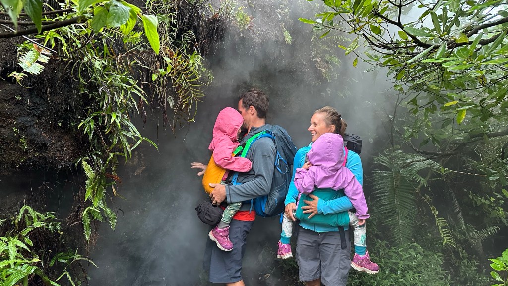 Our guide led us over to the rim of the crater and we were allowed to feel the steam vents releasing their stored up heat. We also had a chance to look over the edge and into the crater. Now full of green foliage we could see monkeys making their way through the trees and up to greet us. We are never that big of fans of monkeys and tried our best to keep our distance but that doesn’t alway go as planned. Lidija wanted out of the carrier to walk around, and this was right at the time the monkeys were emerging in full force. I had to race to pick her up quick as one monkey nearly climbed up her back.