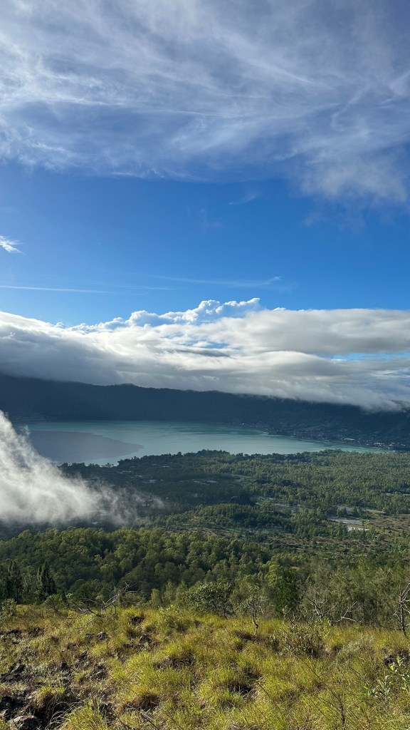 Traditionally you should have panoramic views of Bali in all directions including the stunning Mount Agung and the Bali Sea behind it, but the clouds had another idea of what our view should be. As the morning started to heat up and we worked our way back down the mountain. The girls were getting their second wind and wanted to hike their way out of here. Having multiple routes to the top, we now took a more friendlier path that was easier on the knees as well as better footing even for the girls. This route was also the route the dirt bikes take to get people up to the top for their adventure so we had to keep on the lookout for them zooming by. The clouds were lifting and we were pleased to see all the surrounding landscape, lakes and fields that this beautiful area has to offer.