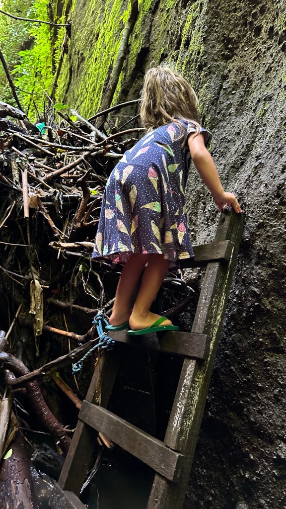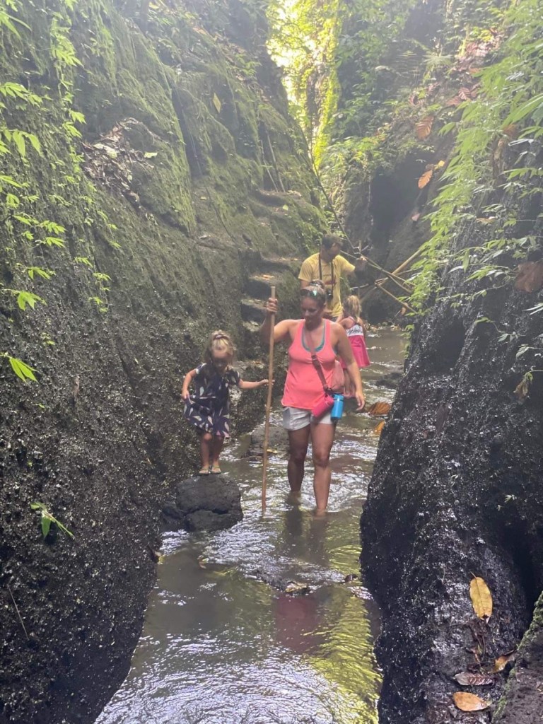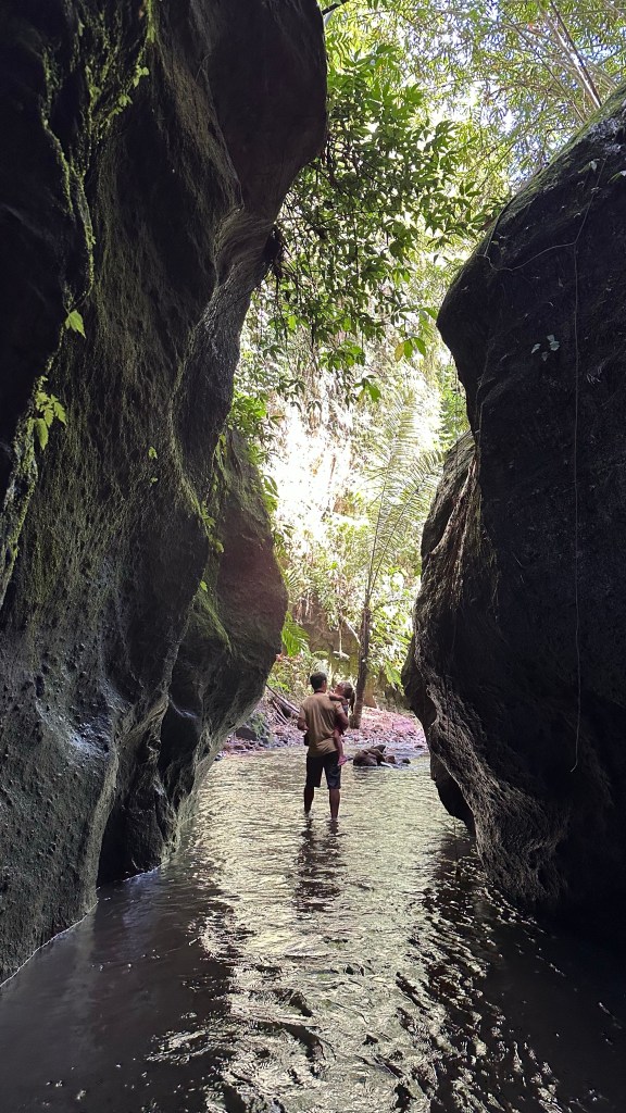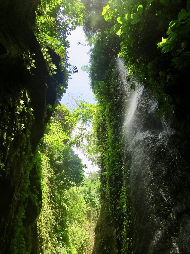 Shannon and the girls chose to turn back while I forged further ahead with the cameras. I was forced to leave my flip flops on the edge of the trail as the 15cm deep mud was far to challenging for the footwear. Once winding a short while further I could see waterfalls cascading down on the right side wall. The green foliage lined the steep rock face on either side of me. I couldn’t help but think what would happen if the skies opened up and drained the traditional rainy season downpour. This narrow slot canyon would drastically fill with a surge of water and I was unsure of the outcome. Only 150 m of walking on my own I turned the final corner and reached the terminus of the canyon, the end of the road. With walls towering 15 m overhead leading up to lush greenery and blue sky the constant stream of clear freshwater made for nothing but a magical experience. There was a staircase leading to a bridge over the water then down into the pool and base of Aan Secret waterfall. You are free to walk around and under the waterfall as you please. While you are here you get this amazing feeling that you are witnessing something that only a small few have ever experienced. The journey is also slightly technical and required a rather hands-on approach which makes the rewarding falls that much more special. After a short while I retraced my steps through the canyon and joined the others on their way back to the road.