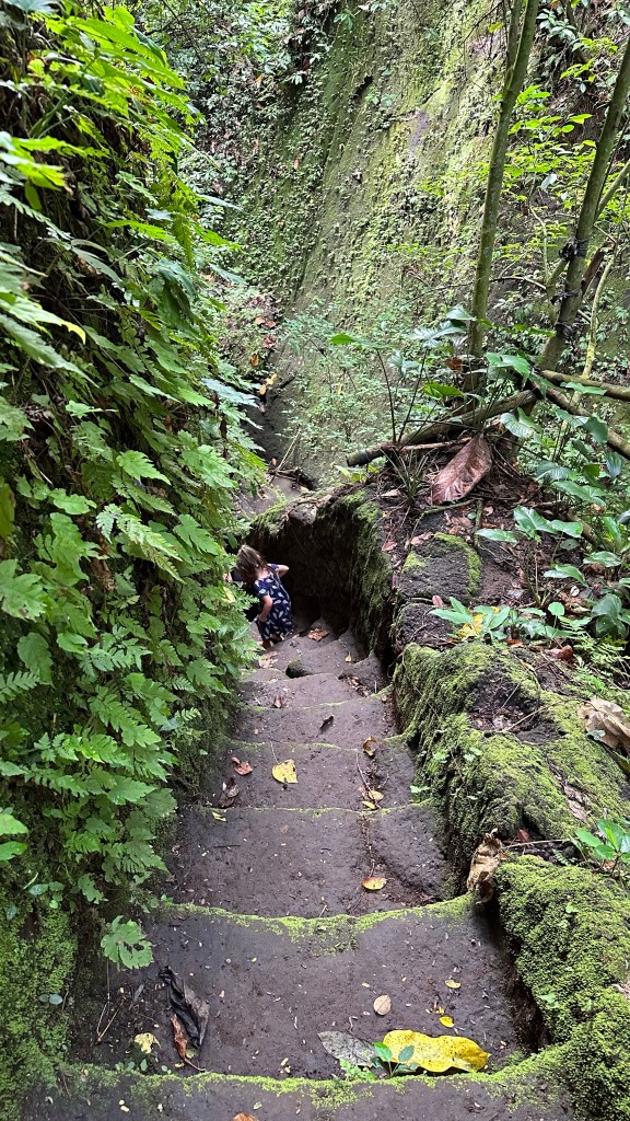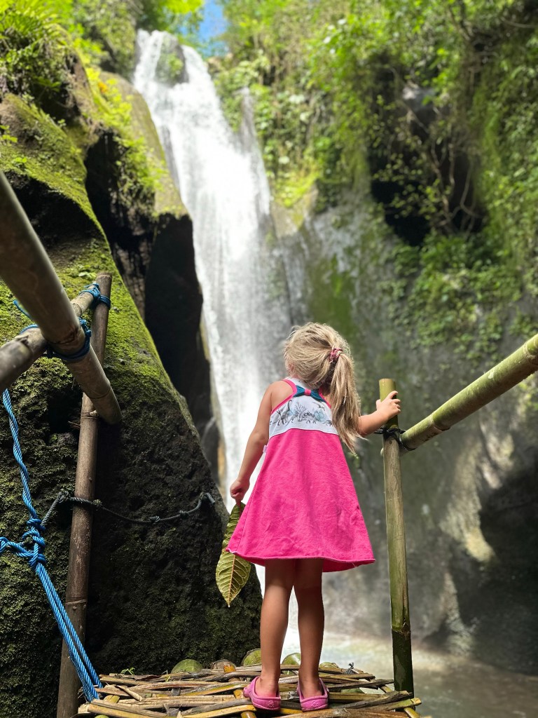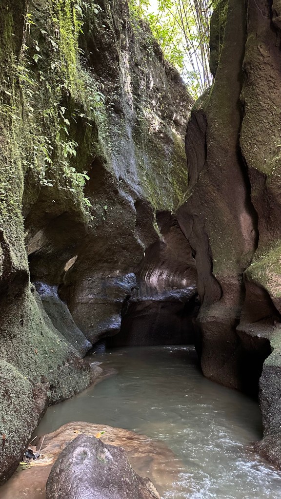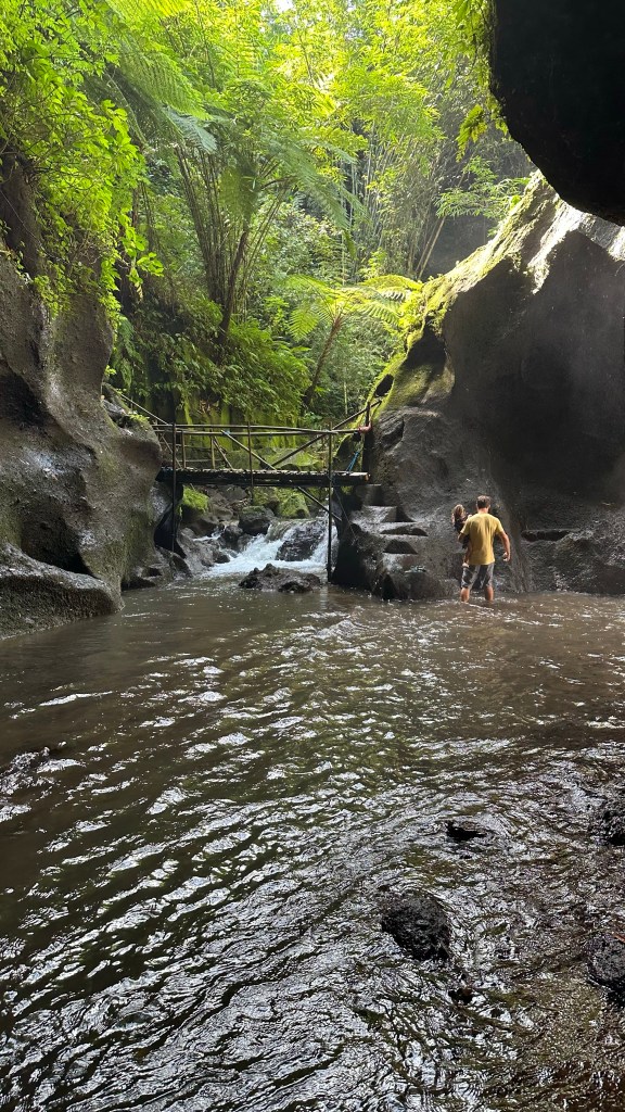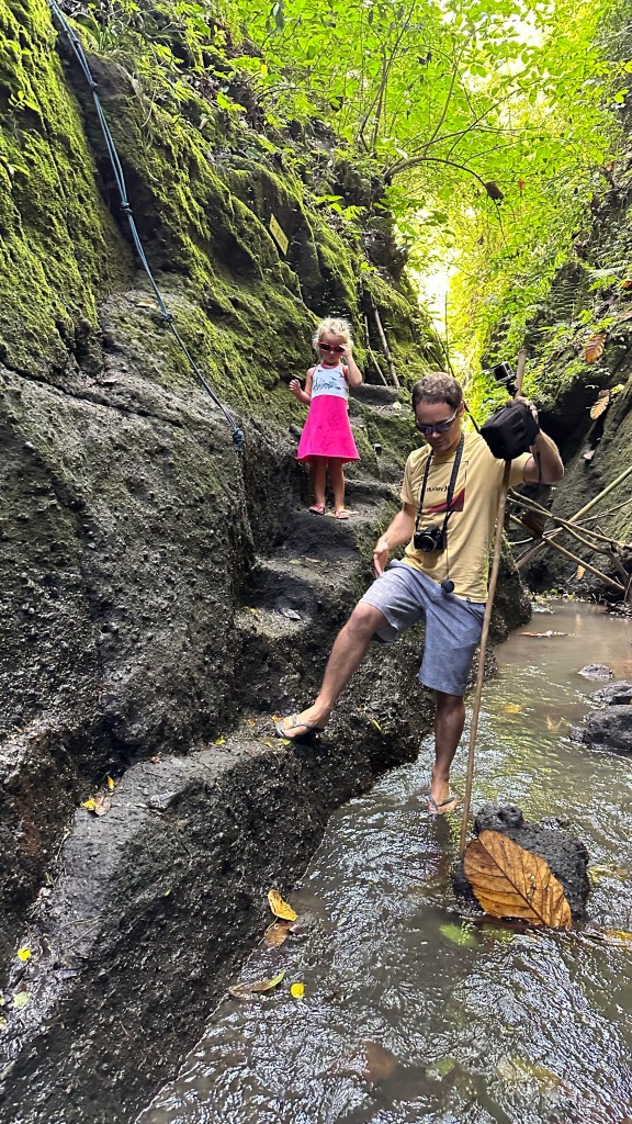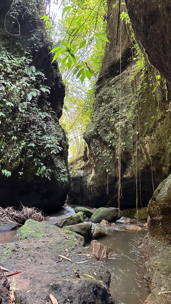 After a day to recover from our interrupted sleep schedule of Mount Batur we were lined up to go on a custom tour through Bali’s interior with a fellow traveller. At 8 am we boarded the car of Chandra, a hired driver and slowly made our way out of the Ubud city limits. Our first stop was to Aan Secret waterfall. Nestled deep in the countryside down unmaintained roads lined with rice fields and orange flowering marigolds we met with the property owner. He also just happened to be one of the calmest people I have ever encountered. He first just wanted to chat with us about what we were hoping to see, how our experience would possibly change us and various questions like this. He went on to explain the amount of effort and energy that was involved to open up the waterfall. As of a couple years prior no one had ever been to it. He spent months with the help of volunteers to locate an access point and create a safe way down to the creek below the canyon walls. Countless hours were spend removing all the dead fall, garbage and other debris that had collected over its lifetime. A series of poured concrete steps with wooden or metal handrails led to carved rocks with ropes down to the waters edge.
