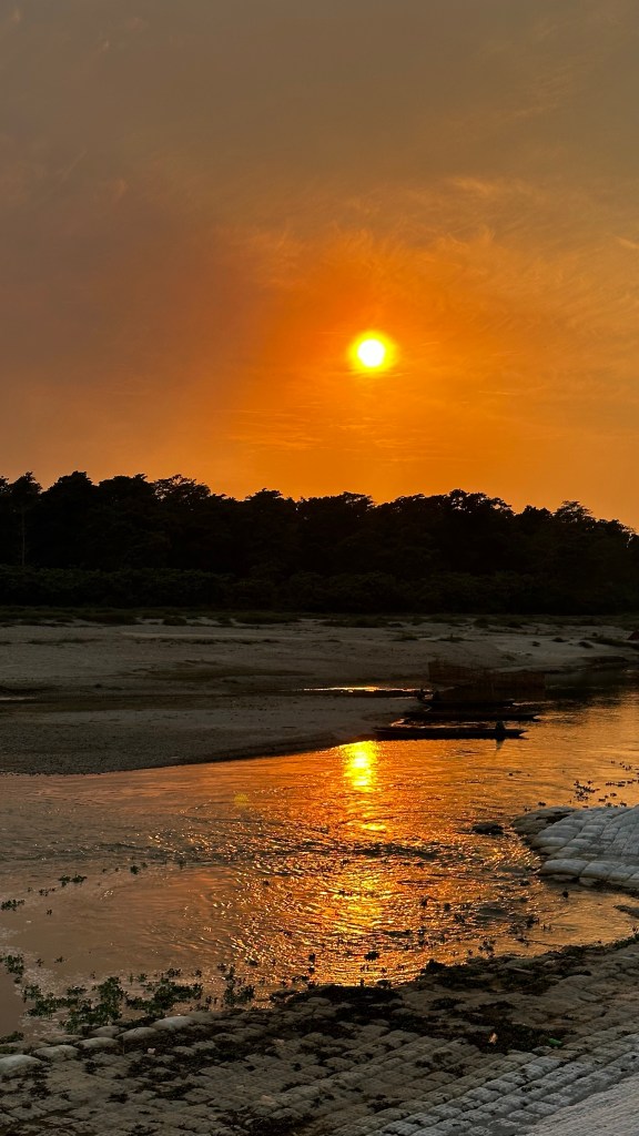 There was a minibus waiting for us at the dirt bus terminal to take us to our hotel, Safari Club Resort. Here we were greeted with a welcome drink and lunch followed by checking into our room and getting settled in. Next, our guide took us for a walk through town down to the Rapti River to observe the sunset and wild animals emerging from the jungle. We were lucky enough to see a wild elephant meander through, down to the river and across. We also observed multiple crocodiles, deer and peacocks all while taking in the sunset next to the river. After this we returned back to the hotel for dinner followed by a short walk to take in a traditional culture dance.
