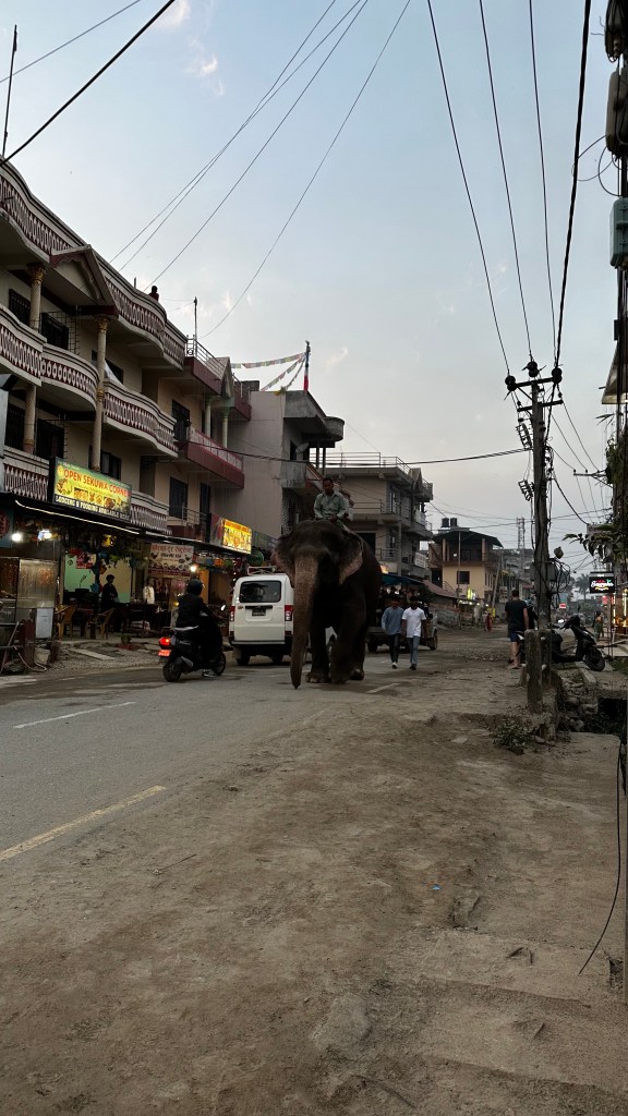 Once we emerged back out into civilized lands we found ourselves at an elephant breeding park. With the help of generous funding the Nepalese government is trying to grow the elephant population as poaching of these amazing creatures is a problem here; like many other places. With elephants producing one calf with a gestational period of 22 months and babies staying feeding off their mothers for a further three years, the natural reproduction curve is dramatically slow without elephant protection. Here they had over a dozen mothers with their young ones in tow. The elephants were kept chained up, which we didn’t exactly enjoy seeing. But once they had all eaten morning brunch (around 10:30 am) they were let loose to wander through the jungle along side their human trainer (driver who sat on the mom’s back). They always return back to the park late afternoon for protection and an easy supply of stocked food.