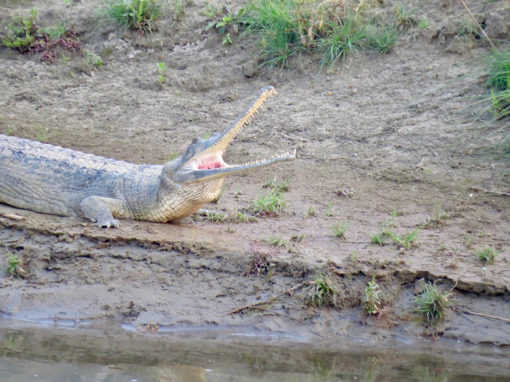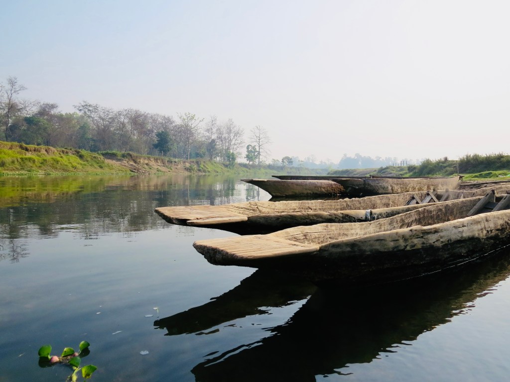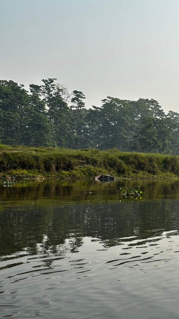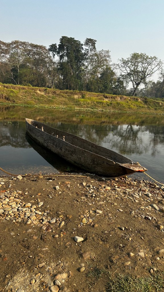 The morning of day two had us waking for breakfast by 8:00. We were joined by a few others and took a short drive through town where we pulled alongside some traditional dug out canoes along the river bank. Once loaded up we started our silent float down the Budi Rapti River. The guide was amazing at spotting and naming all the birds both colourful and camouflaged resting in the trees. The shores were lined with multiple crocodiles, and we would all see who could spot them first. Being in pre-monsoon season the shallow waters were a peaceful 45-minute float as we wound our way along the edge of the jungle.