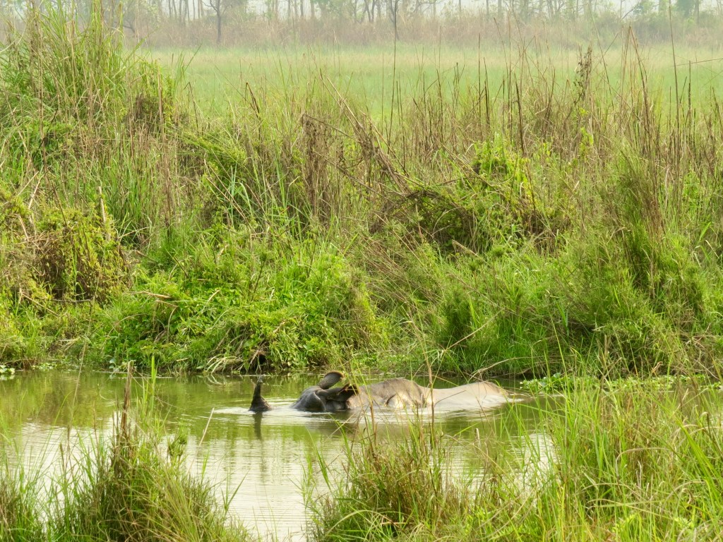 We returned back to the resort for a bite of lunch and a relaxing break where we could swim in the pool and cool down from the now 30 degree heat. By 2:30 however we were back out for more adventures. This time we found ourself in the back of a covered pickup truck and bouncing around the lowland of the park. Spotted deer were scattered all aver the place while the peacocks were putting on their traditional mating season display of feathers. The truck would cross through thick jungle with trees towering over head then open up to low lying grass lands and prime grazing grounds for the one-horned rhino. Our guide spotted two grey figures across the way and his binoculars were a necessity to view these breathtaking creatures. They walked the tree line and slipped back into the forest before we could get any closer. Once rounding the corner we came across a rhino partially submerged with the top of its head and backside out of the water. Before leaving the area no jungle trip would be complete without a visit by some monkeys. The tree tops were full of them as they leapt from branch to branch eating leaves and fruits.