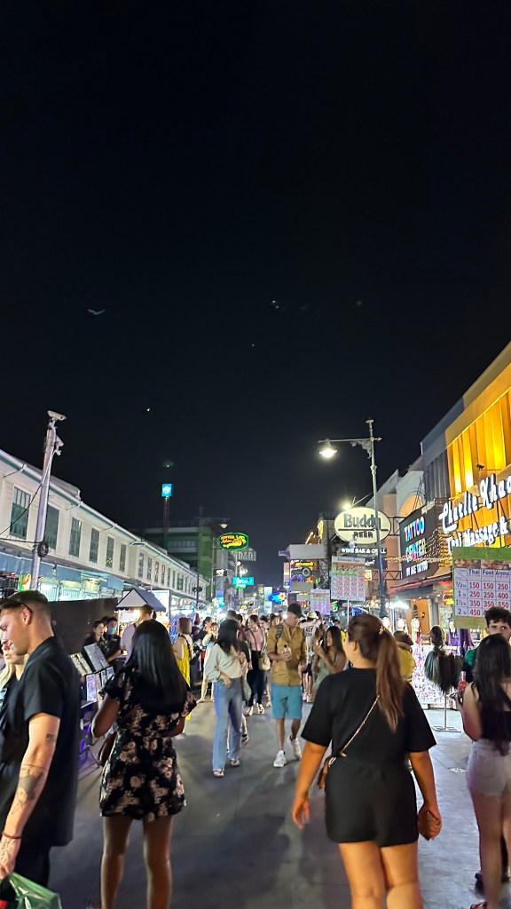 After checking into our room we all ventured back to the walking street for a quick tour and to gather some street stall food for dinner. Shannon had been longing for some Pad Thai since Indonesia and now she had the perfect opportunity for the real deal. After a white styrofoam plate of flavoured noodles, a plastic fruit cup of pineapples and mangos, along with a small handful of meat sticks we casually found our way back to our hotel room. The girls were in a bit of shock with all the commotion and not overly pleased with the noise level outside. There were literally thousands of tourists walking the streets, shopping the stalls and partying in the clubs. You could barely move two meters without bumping shoulders with a passer-byer. Khaosan Rd is not for the faint of heart however. The street stall aromas waft flavours of amazing food and some not so familiar scents. Buttered corn on the cob, Pad Thai, kebabs, spring rolls and tropical fruit are the most common. You will however stumble across cricket and grub worm venders along side roasted crocodile, tarantula and black scorpion. It also comes with a bit of caution as drinking and drug use can get carried away as hours seem to slip by. Marijuana displayed on collapsible tables lines the streets, hashish hooka pipes rest between friends and laughing gas filled balloons griped in hands of laid back travellers looking to keep themselves smiling. This is what you see just walking down the streets in the open. You can only imaging what happens behind closed doors.