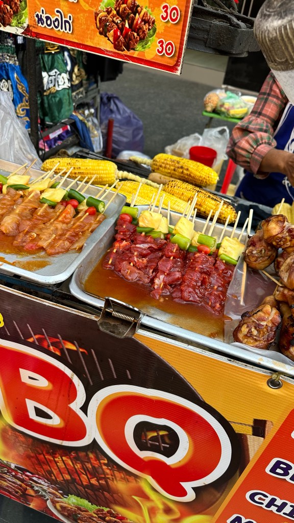 We fell asleep to the sound of music thumping and we woke to near silence. Reappeared in the street it was like we were relocated entirely to a new location. The black paving stone street was being swept clean by workers. Garbage trucks had cleared the grime, storefronts were closed tight behind metal gates while cars and tuk-tuk drivers waited for business opportunities to surface. Just a block away the locals stalls were open for business. With every turn of a corner you can find anything you want, and I mean anything. Department stores with everything from business clothes to pyjamas, sporting goods to kids toys. There are produce stalls, and bed sheets nestled together under canvas awnings in the streets. We found our favourite breakfast location of fresh baked waffles (20 Baht) and fruit smoothies (30 Baht) located between the fitted mens dress shirts and knock off backpacks.