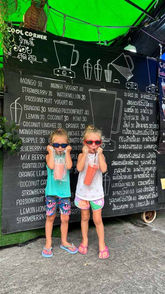 Oh what a place! For those of you that have never been to Bangkok, it is a city like no other. We landed here after our three and a half hour plane ride from Bali, Indonesia. Wheels touched down around 10:00 at night and after immigration, baggage and a taxi ride we were dropped off on the fringe of Khaosan Rd by 11:30pm. I have been in and out of Bangkok multiple times over the last 20 some odd years but this was a first for Shannon and especially the girls. Both girls had fallen asleep in the taxi so we were stuck trying to figure out how to juggle two mammoth 120L duffle bags, two 40L backpacks and two sleeping four year olds. I put one duffle on my back and a backpack on my front while Shannon donned her pack, held Lidija and then also picked up Bexley. We then each took a handle from the second duffle and started walking. The girls woke up by this time with the loud music and crowds. Their eyes were like saucers. A lovely couple saw our struggles and took a bag from each of us and walked us the final 100m to our hotel. Khaosan Rd has been the backpacking hub of Bangkok for well over 30 year now and has evolved and expanded to all the neighbouring streets.
