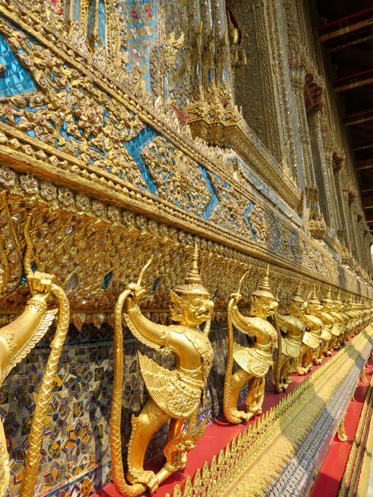 One of our first sights was the famous Grand Palace along the Chao Phraya river bank. This is also a within walking distance from our hotel. However we were all feeling lazy and the thermometer was topping out with a humid 35 degrees so we hired a tuk-tuk to drive us instead. After the 500 Baht entrance per adult and a 200 Baht purchase of pants, as I did not have any, we eventually crossed through the gates. Once inside it seemed like all the hustle and bustle of Bangkok just slowed down. The city smog seemed to not exist and the general noise was also eliminated. This walled rectangle enclosed over 2.3 million square feet of Thai history and is one of Thailands most popular tourist attractions. We spent the next couple hours touring through and around the numerous golden structures that once housed the King of Siam and all the government dealings. Its carefully manicured flower beds are not to be missed. Once back outside it was quick and easy to arrange any sort of transportation you would like to take you to your next location. There is also a river boat dock if you care for a water taxi. Be sure to check the timetables and dress code before you head out.