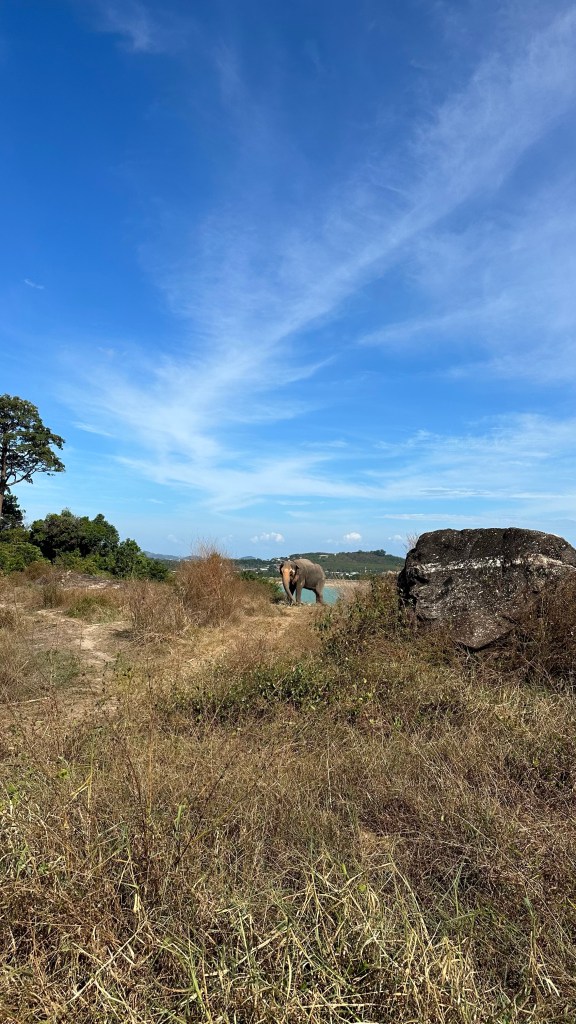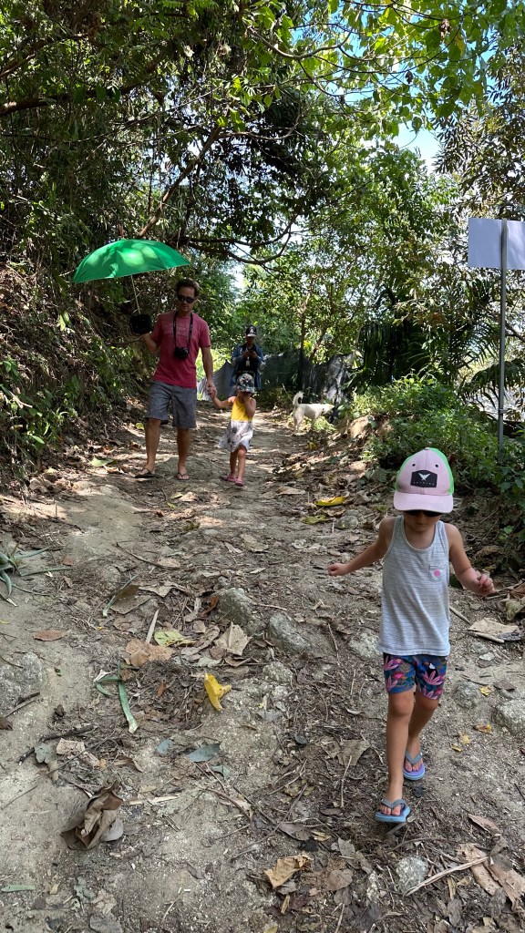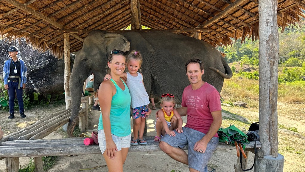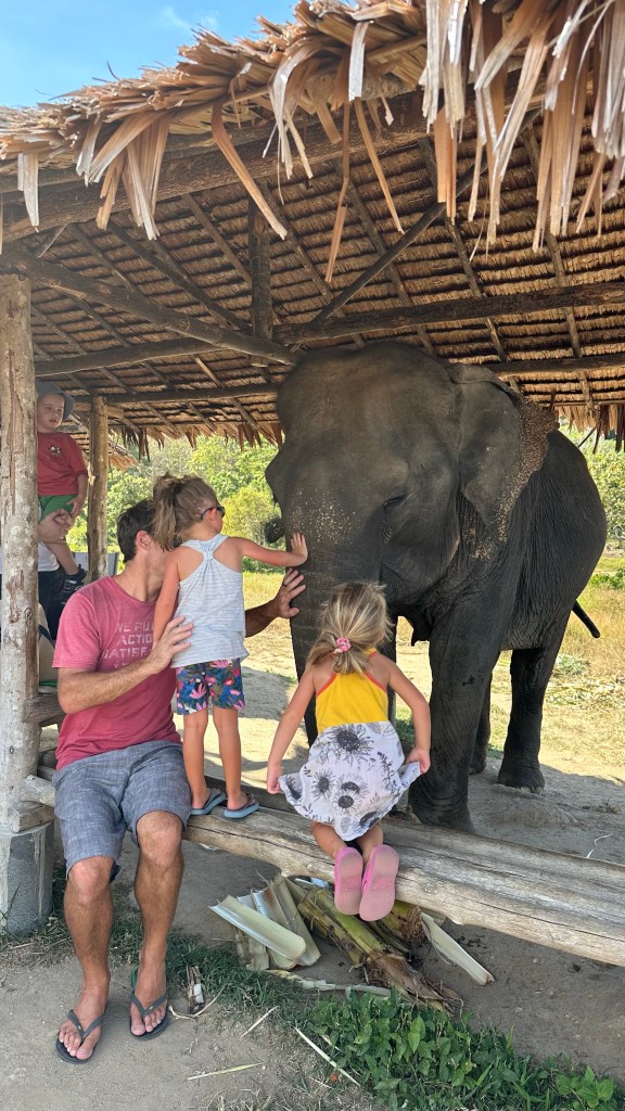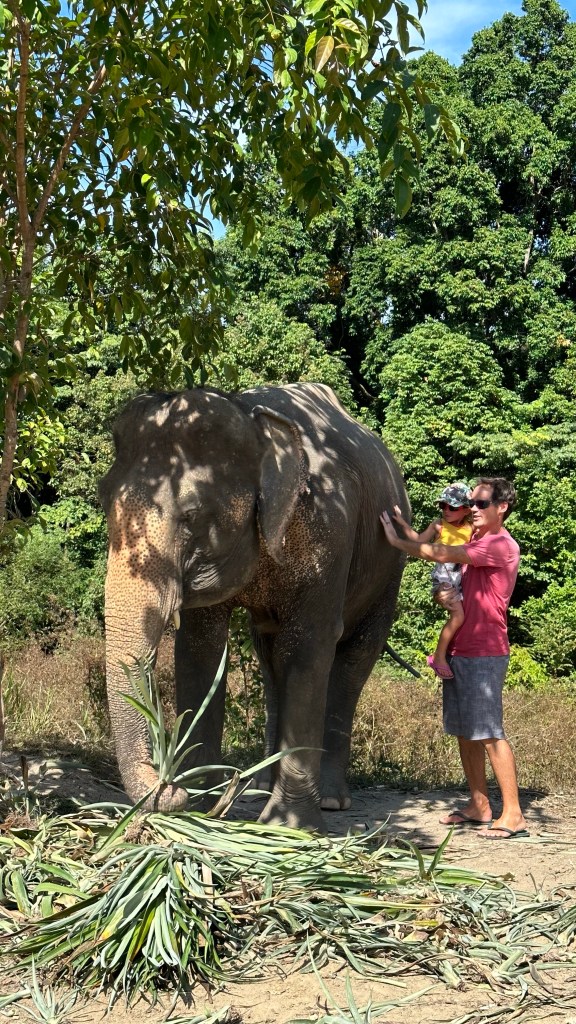 We were on the fence about visiting any elephant sanctuaries as we just didn’t know how these animals are really treated in captivity. I had seen someone else talk about this one, so after a bit of research we agreed it sounded like a good opportunity to take the girls. This park doesn’t believe in riding of the elephants or bathing with them. All of their elephants are rescues from logging camps, shows or other activities. Each elephant now has its own professional mahout to care for it. The park borders the Klong Kata reservoir with its huge land parcel with natural forests and ponds where the elephants have access to roam free and bathe daily. There are acres of greenery which is plentiful for the elephants to explore and feel like they are in the wild. The full tour we chose was approximately two hours. We arrived and watched a short video explaining the park and how it operates before they brought the elephants to us for our first interaction where we fed them bananas. They then directed the elephants out into the park as we followed, getting to observe them in their natural habitat. We were able to get a few photos near them while they ate, then continued on to see the others.