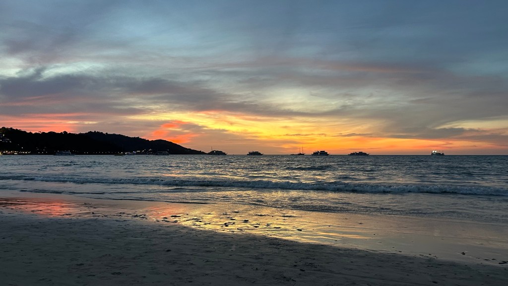 Our second day at Patong Beach was a simple one. We enjoyed breakfast around 9:30 at the lunch spot from the day before then quickly stepped across the street to get our toes into the soft sand once again. We found some green umbrellas with lounge chairs and table that charged us 200 Baht for the full day until sunset. That is exactly what we did, relaxed in the chairs, read our books, swam in the ocean and played in the sand. Lunch and dinners could be purchased from the local servers that frequently stopped buy but with no commitment to them we chose to cut our costs nearly in half and go pick something up ourselves and bring in back to the beach. The afternoon sun was getting too much so we returned to our rooms with ice cream to enjoy the cool air conditioning and regroup for the evening.