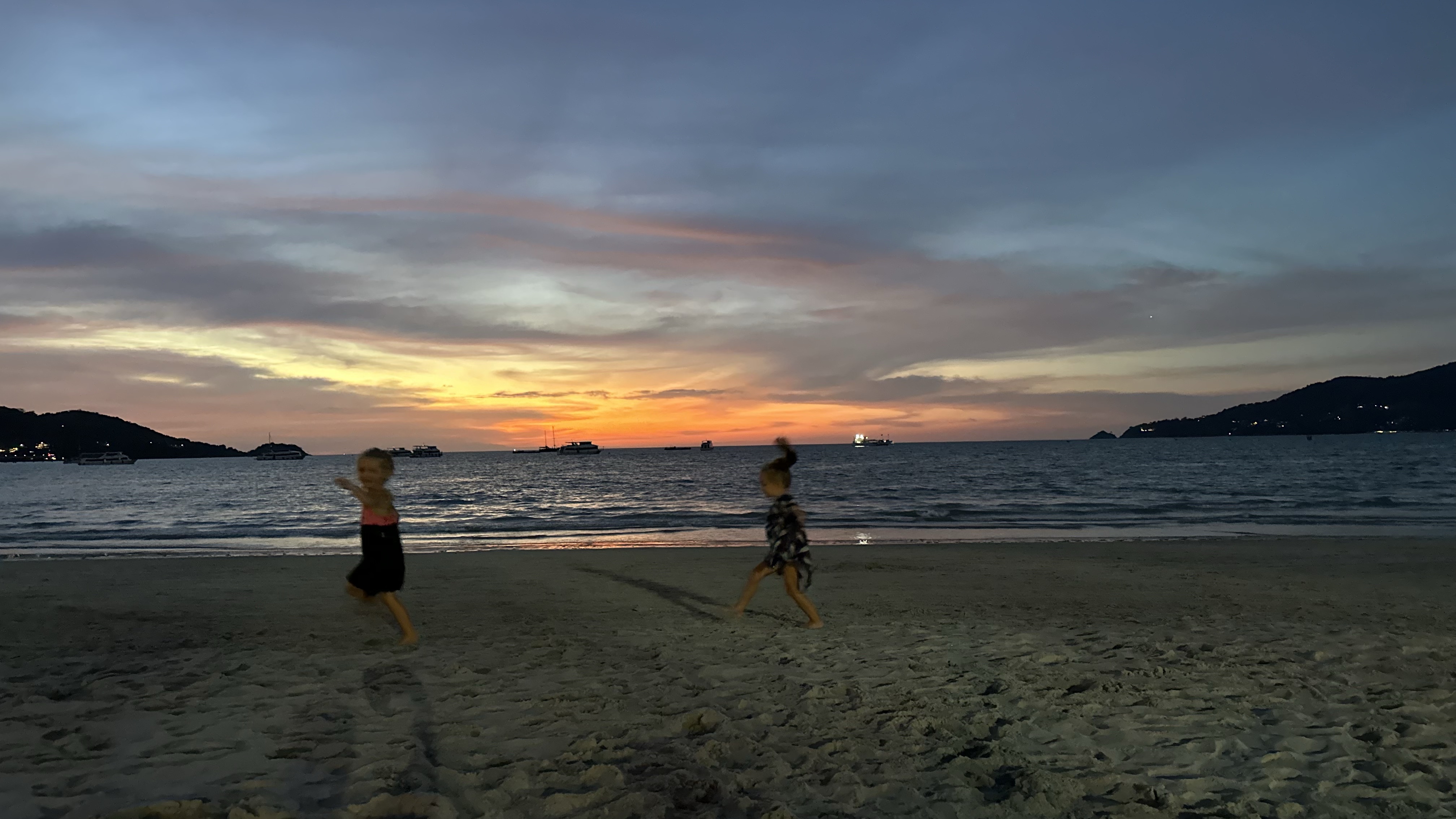 Our second day at Patong Beach was a simple one. We enjoyed breakfast around 9:30 at the lunch spot from the day before then quickly stepped across the street to get our toes into the soft sand once again. We found some green umbrellas with lounge chairs and table that charged us 200 Baht for the full day until sunset. That is exactly what we did, relaxed in the chairs, read our books, swam in the ocean and played in the sand. Lunch and dinners could be purchased from the local servers that frequently stopped buy but with no commitment to them we chose to cut our costs nearly in half and go pick something up ourselves and bring in back to the beach. The afternoon sun was getting too much so we returned to our rooms with ice cream to enjoy the cool air conditioning and regroup for the evening.