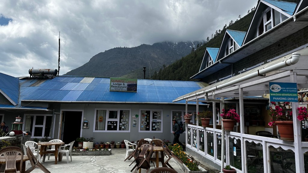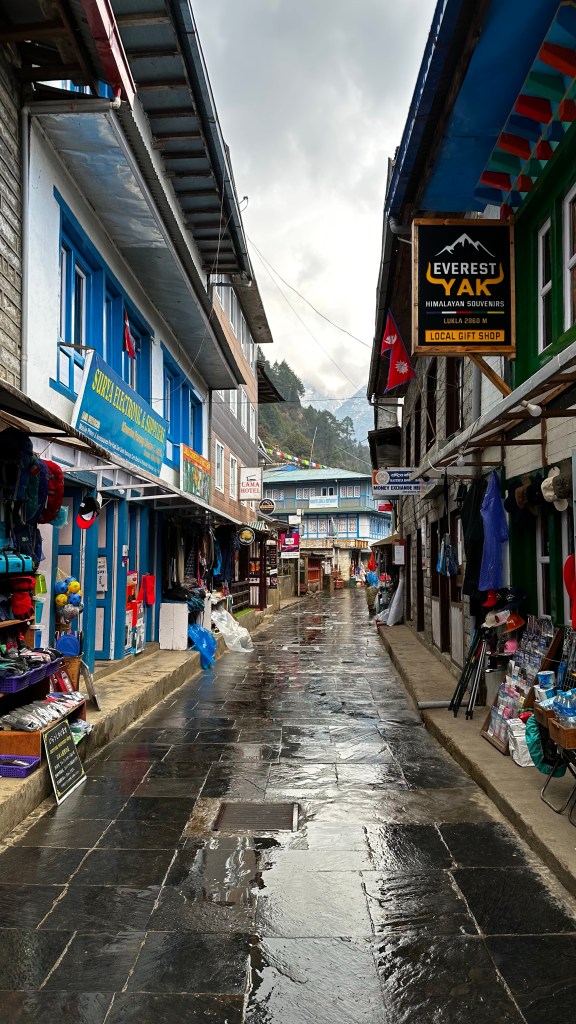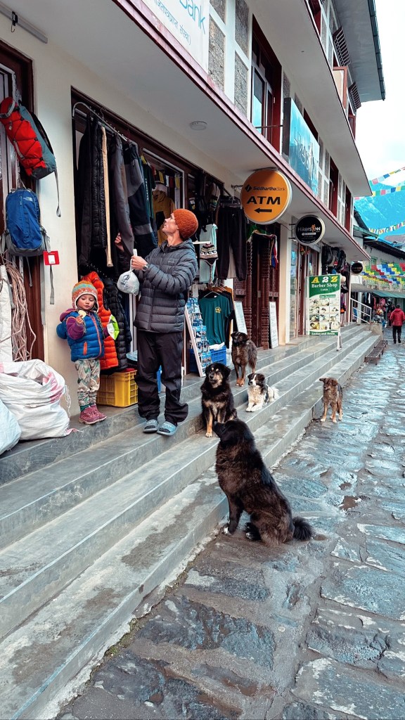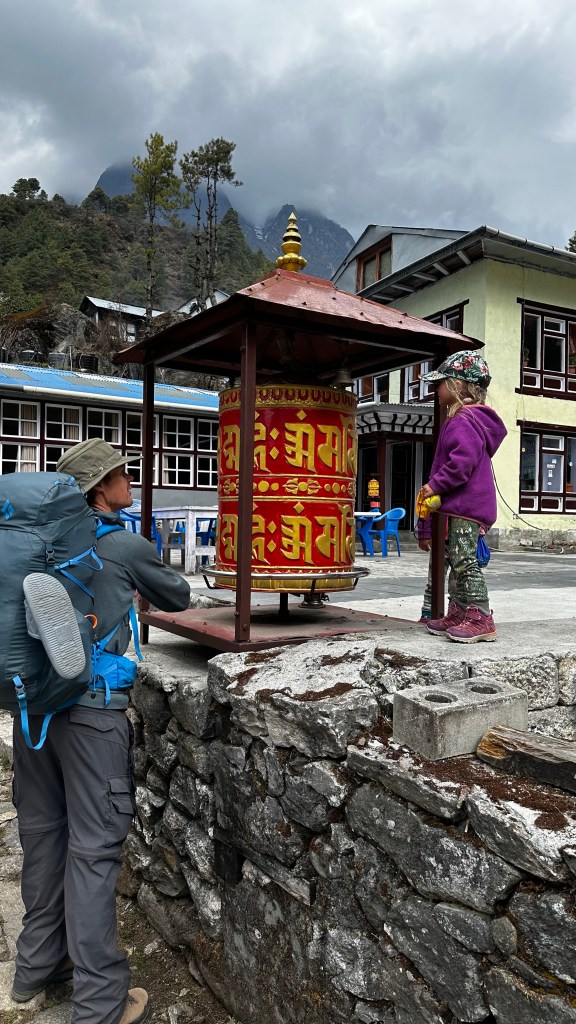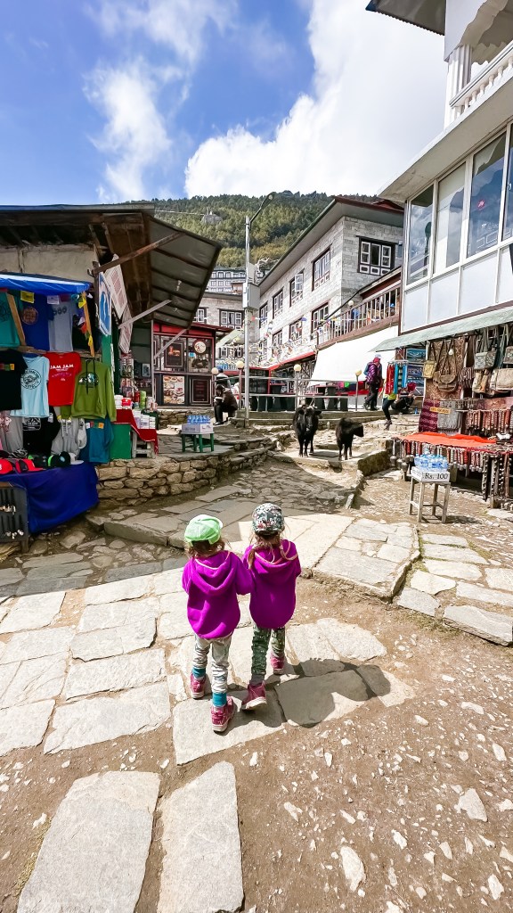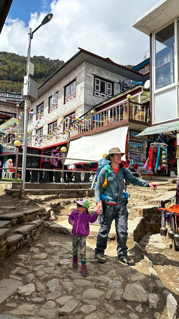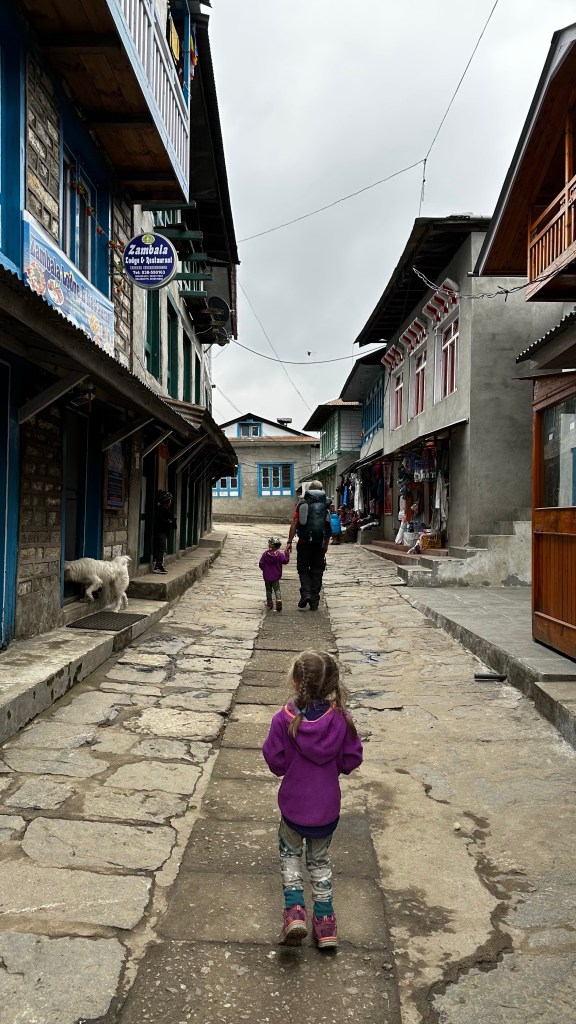 We covered the three kilometres to Ghat (2546m) by 10:45 then ascended to Chheplung (2548 m) a further three kilometres by 11:50. The girls started off great but promptly lost steam once the uphill came upon us. We were forced to resort back to some of our old tricks again. Lots of games, stories and rounds of eye spy were needed to keep them moving. We were fully willing to load the girls up and carry them but emotionally they didn’t want that much to do with moving anymore. We set 100 metre milestones at the next prayer wheel or bridge crossing and inched our way along the trail. We could see and hear the planes props chopping at the mountain air so it was easy to calculate our progress. Stops were frequent but this was welcomed. We new we could make it to Lukla so we were in no dire rush to beat the clock. We eventually registered out of the Lukla (2840m) checkpoint by 1:35 and a further ten minutes of walking down the cobblestoned street we read a sandwich board with the name “Hiker’s Inn” upon it. They boasted complimentary wifi, hot showers with fresh towels and beds with comforters for 1300 NRs. We were sold in an instant. We covered the final two kilometres of our eight kilometre day in two hours.