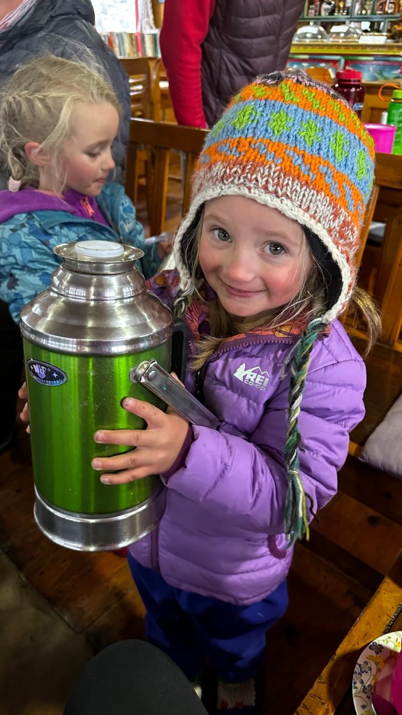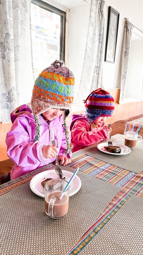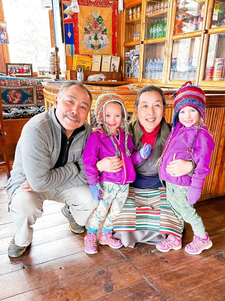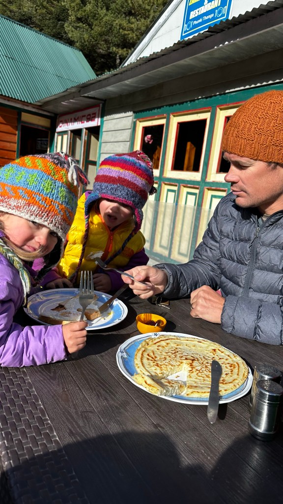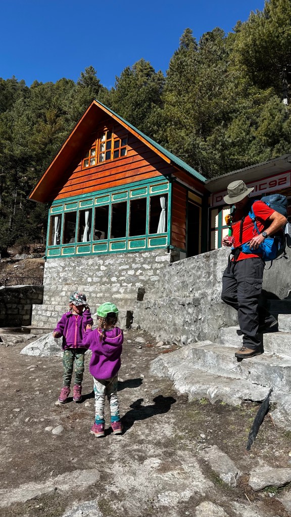 We passed the fallen climbers monuments and made yet another stop back at the Kala Pathar tea house in Dughla for another a quick hello with hopes of pushing on further to lose some more altitude on the day. The amazing owner would not let us leave and the girls were overly excited to reunite with her again. She sat them down and cut them each a slice of freshly baked chocolate cake with chocolate icing and a cup of hot chocolate, as well as hot mango tea for Shannon and I.