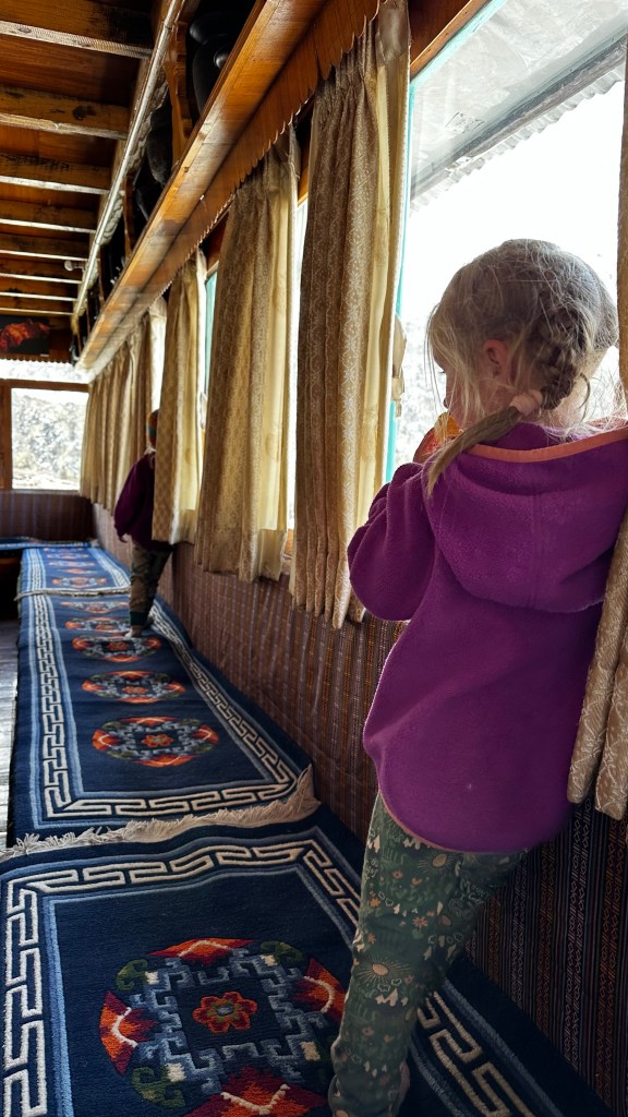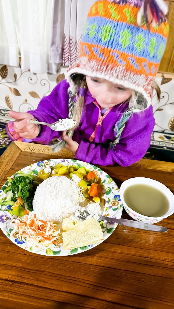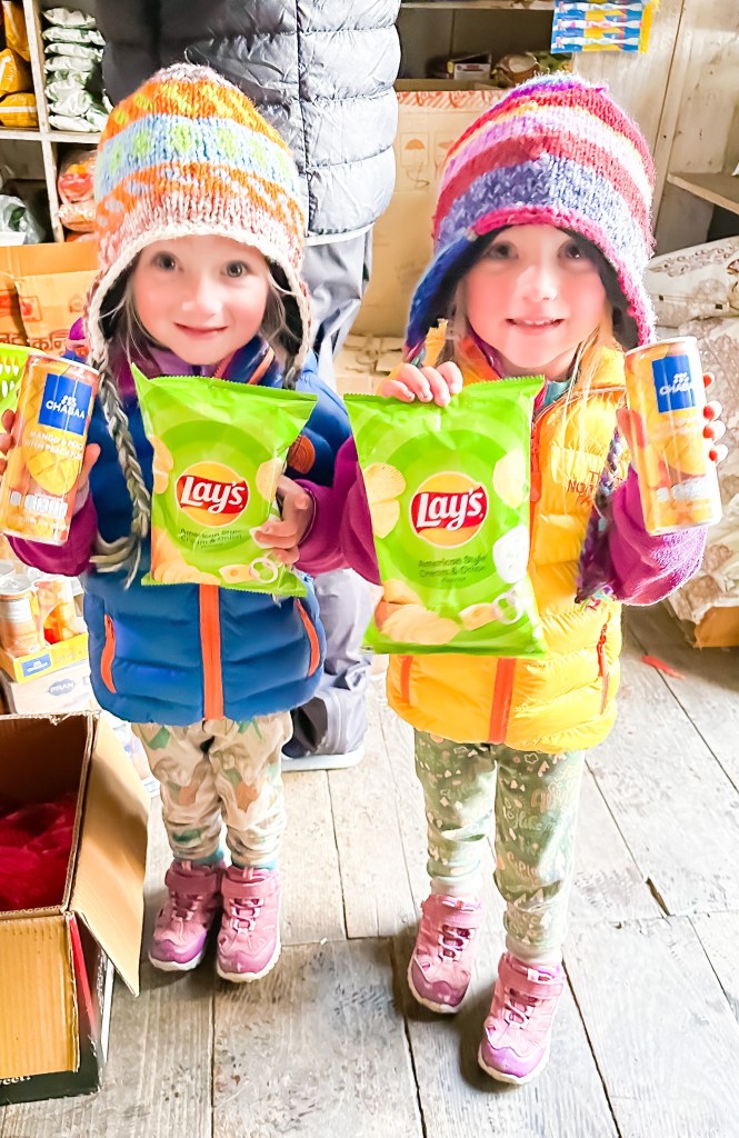 After strolling the only street one more time to pick up a few unneeded snacks before returning for dinner at our hotel and basically wrapped up our day. Chicken lasagna this time with some Himalayan macaroni, whatever that means. A popcorn snack was followed by a lay down in the first real bed since we left Kathmandu 16 nights prior. With the sheets pulled up under our noses the girls barely made it to 8:00 and us two managed an extra hour before drifting off asleep.