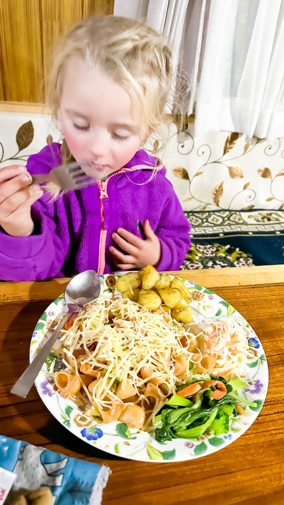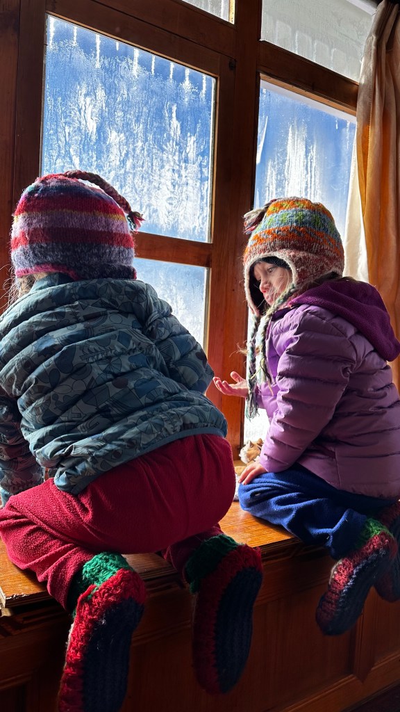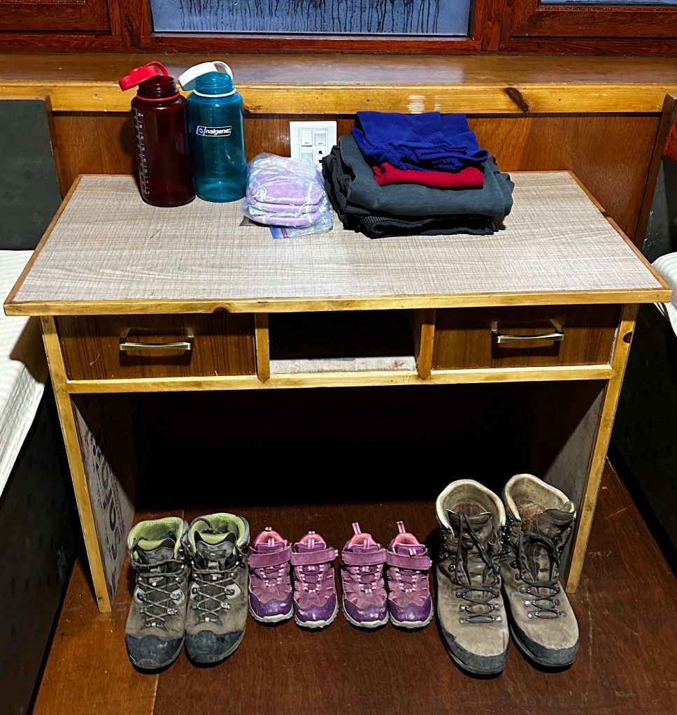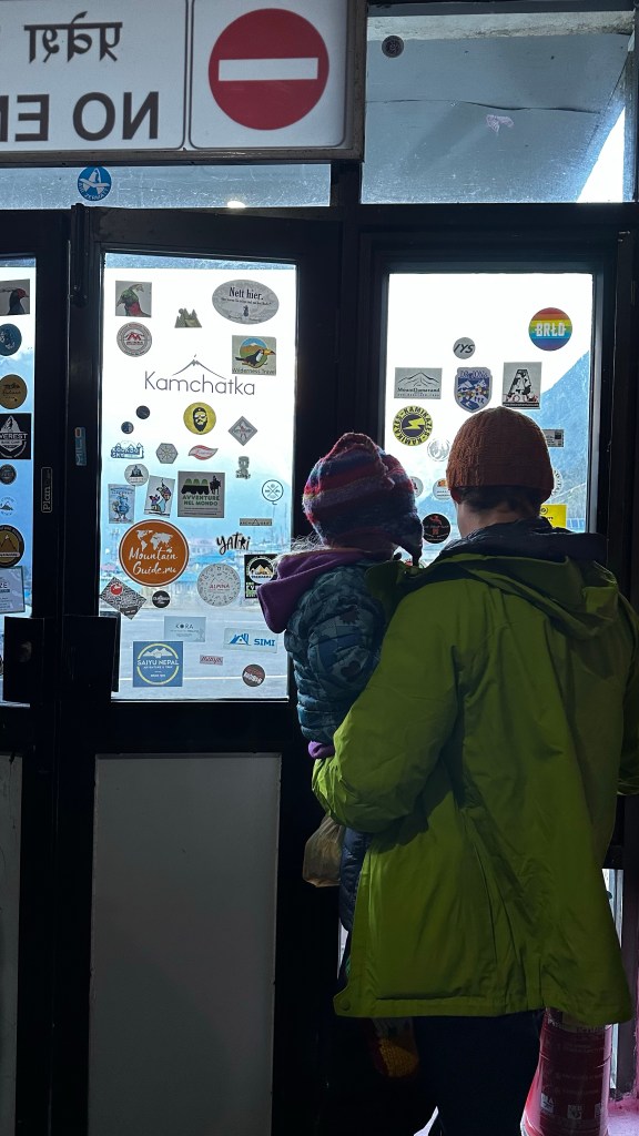 The girls were mentally prepared to stop here so it nearly broke them when told them of our decision. So they went into the carriers for all of 500 meters before we rounded a corner and Phakding (2600m) was in sight. The littles needed out and started running down the trail. Shannon and I with our bags could barely keep up. With now clear skies at 5:45 in the afternoon we checked into Sunrise Teahouse (500NRs) our 19 Kilometre day was complete. After a week of hiking every day the girls were just three kilometres short of completing a back country half marathon high in the mountains. The numbers nearly blew my mind, they just didn’t seem to add up. We barely dropped our bags into our corner unit room before making a b-line to the dining hall to get some dinner in our hungry tummies. Dal baht and macaroni all around. The girls as usual were bouncing around the dining hall like they had all this stored up energy. I ended up chatting with a fellow trekker who appeared to be in his 70’s, and from Norway. He was sharing stories of how he summited Mount Everest back in 1971 and was the 170th person to do so. He had some unbelievable stories of the trails, villages and the logistics of the trek back then. 1200 porters and the trek to basecamp took 30 days as the trailhead started just 40 kilometres from Kathmandu. He was doing his hike with his adult kids and believe it or not, he had kept in contact with his guide and one of the porters after all these years and they were all doing it together now. Unbelievable and inspiring! The sun had now shifted behind the mountains and the mild chills were creeping in. The four of us slinked back to our room and settled in for the night.