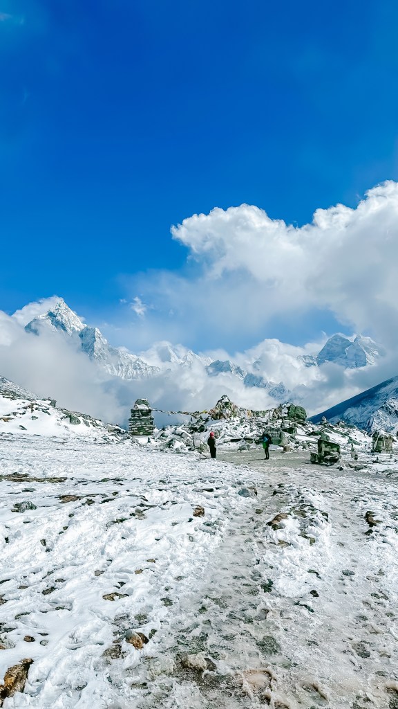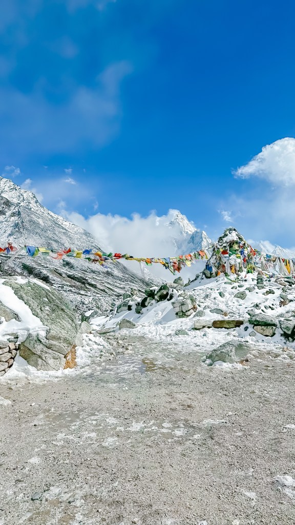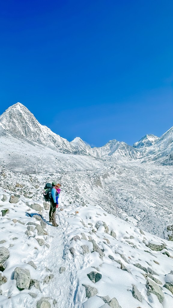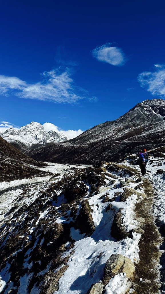 Today we were woken by the unmistakable clap of helicopters, huh. Yesterday we took a chance and chose to make the trek to the EBC rock with overcast skies and thoughts of the following day being worse. But now the sky was a brilliant shade of blue behind the soaring giants of snow and rock. We took in the mountain views through the dining room windows and savoured breakfast of cinnamon pancakes and eggs on toast. With our bags loaded up and our two day bill of 18,500NRs paid, we were a little hesitant to head out the door and start our way back down the mountain. Not because it was symbolizing that our journey was coming to an end, or that the scenic views were just to beautiful to leave. Although both of these situations were true, our main reason was that the current temperature was just slightly above the overnight low of -17°C.