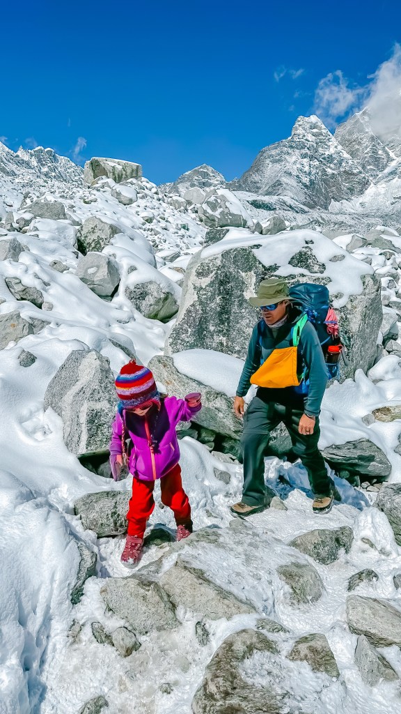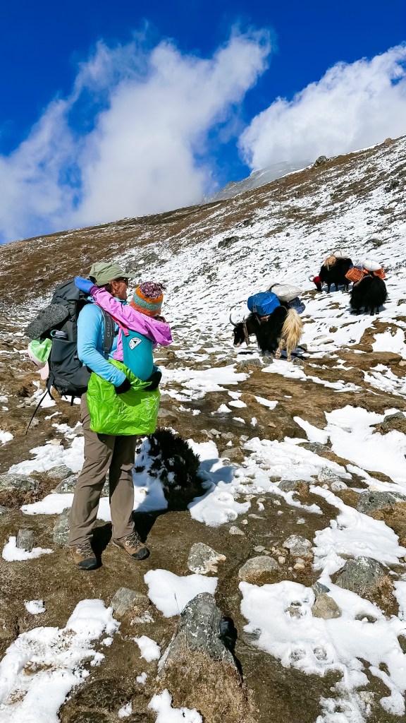 By 10:00 we said our good-byes and closed the door behind us as we started day one of retracing our steps down the mountain. Back into the bolder fields of snow and ice, Shannon and I carried the girls for both warmth and speed. We were now onto our fifth consecutive day of hiking above 4000m and the girls were starting to feel it. With our little beauties resting in the Trail Magik’s we quickly weaved our way over the erratic terrain and up to the Lobuche pass. These mountains are unbelievable. Navigating through the icy stones with the exaggerated steps caused some issues as Shannon slipped a foot and came tumbling down. No one was hurt but it surely secured the deal that the girls did not want to hike through this section. We shortly dropped down off the glacier and onto the flats, the girls wanted out to stretch their legs, and we were happy to have our load lightened in doing so.