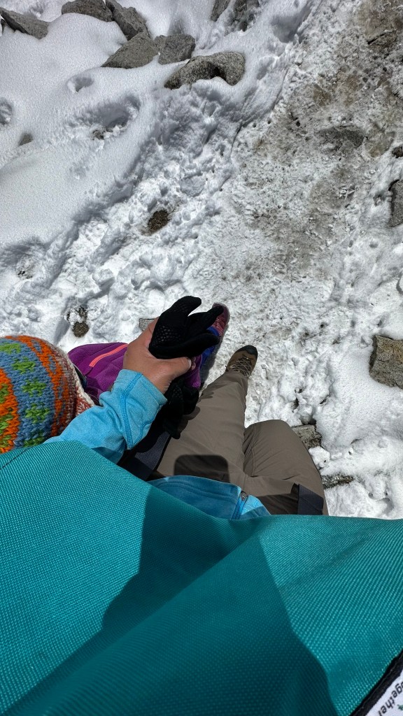By 12:30 we returned to the New EBC Guest House for a vegetable fried noodle lunch and visit with the owners and a couple familiar faces from three days back. We passed on our trekking guidebook to another adventurer, picked up two Bounty chocolate bars for 500NRs and continued the descent. By now the snow had all turned to slush and mud so this meant the girls were on our fronts once more as their hiking boots didn’t come up high enough to not get wet feet.