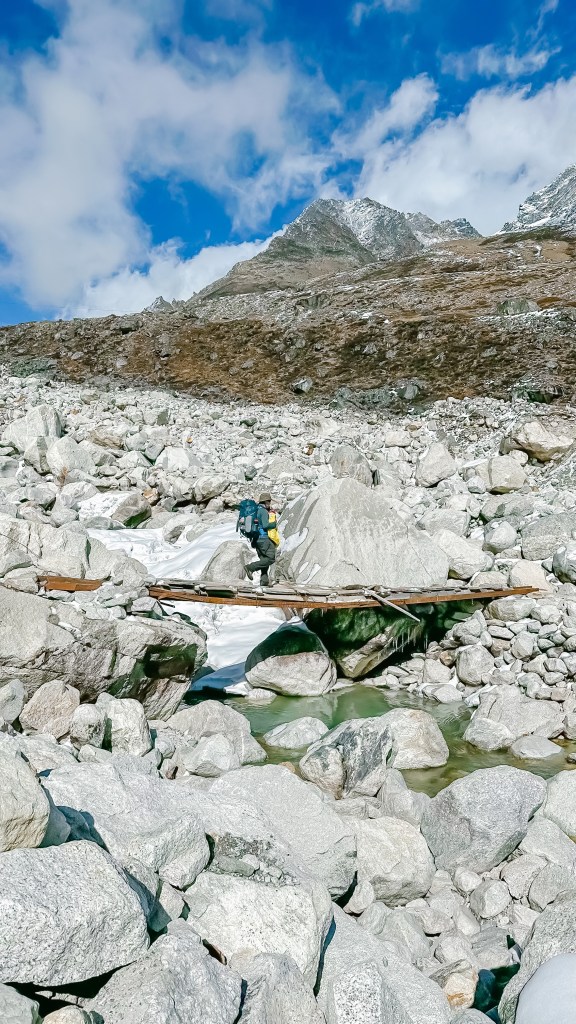The sleep was amazing, the best we had had in over a week. Never in the past have I considered being overly acclimatized to the elevation and not having a frozen face in the morning a blessing, but it sure was this morning. We filled our bodies with warm food, cleared up the tab of 8500NRs, and were on the trail by 9:00. We started out the day following the river with -1°C wind at our backs and the sun shining in our faces. We crossed to the other side of the Tsola River and started uphill. Bexley wanted to hike and Lidija needed to be carried.