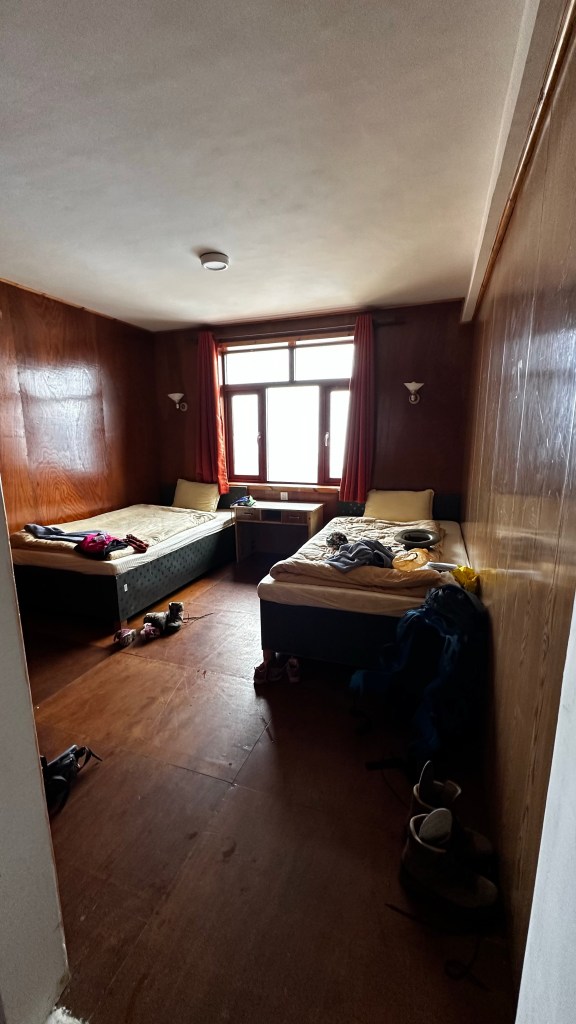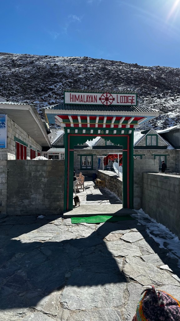 We instantly dropped our bags down and climbed the stairs of this four story stone lodge to the glass surrounded dining hall with views in every direction. Sitting down we enjoyed a feast of a lunch consisting of spaghetti bolognaise, chicken burger and fries, Coke and tea. It was amazing. With full bellies we headed back down stairs for a much needed clean up. Our last shower was back in Dingboche on our second acclimatization break. We had gone eight days of wearing a toque every day and hiking 72 kilometres with not much more than a handful of baby wipes between the four of us. Needless to say the steaming shower that required two rounds of shampoo could be compared to nothing. This followed up by fresh cotton towels was the icing on the cake.