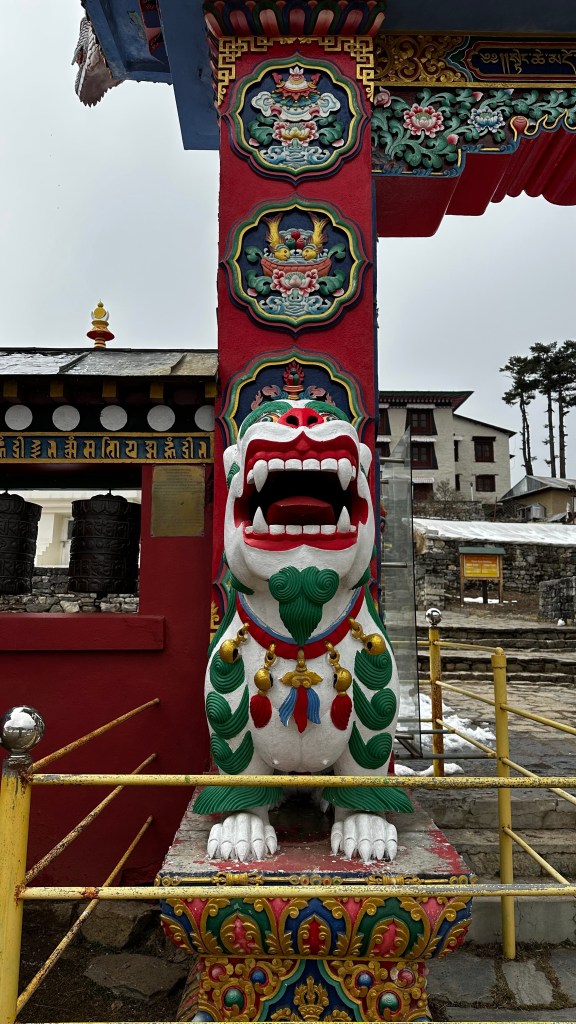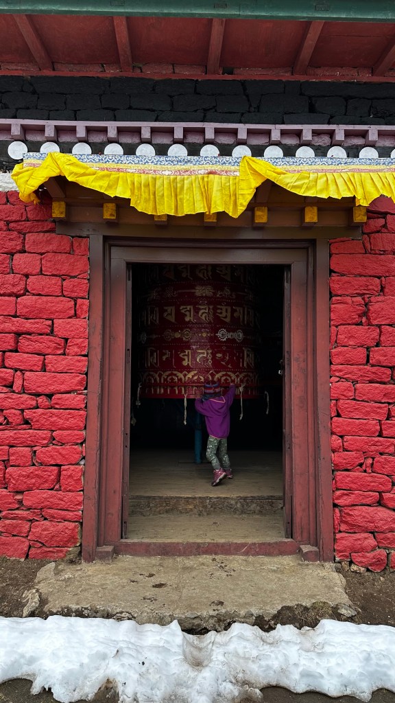The time came to push on. Down we went, across the river once more and into Deboche (3730m) by 1:15. From here we were now on the other side of the valley and it is obvious they don’t get nearly as much daily sunshine. Also being hidden below the still un-bloomed rhododendron trees, snow, slush and mud had now taken over. Every foot step was dramatically slow as we want nothing to do with falling down in the slippery mud. With so many yaks and mules on the trail you never know what you might land in. As the girls boots only stand a couple inches tall we loaded the girls in the carriers once more and carefully climbed our way up to the Tengboche Monastery (3890m) by 1:45.