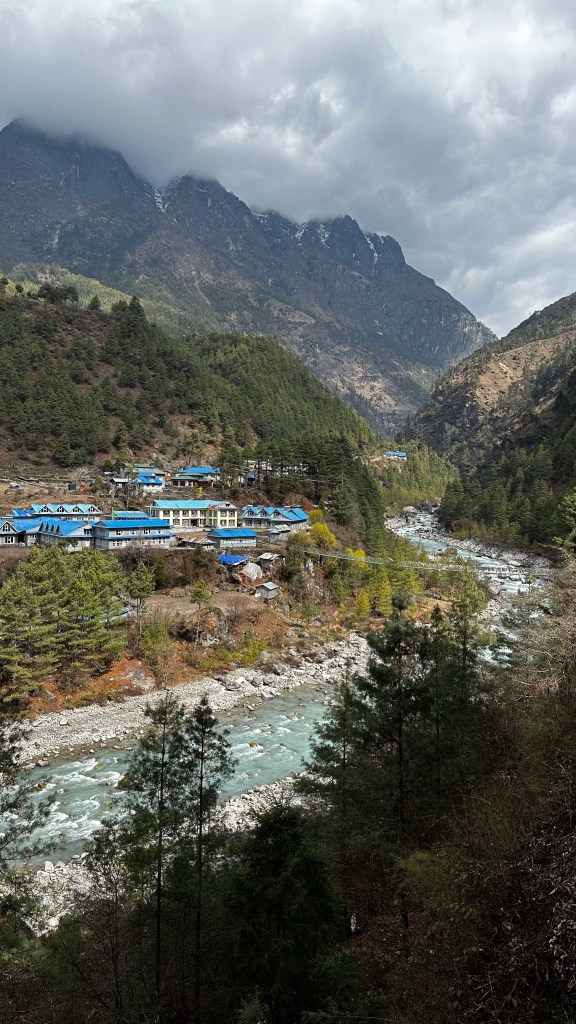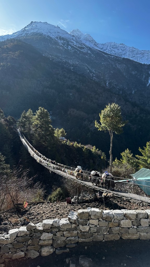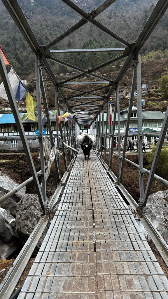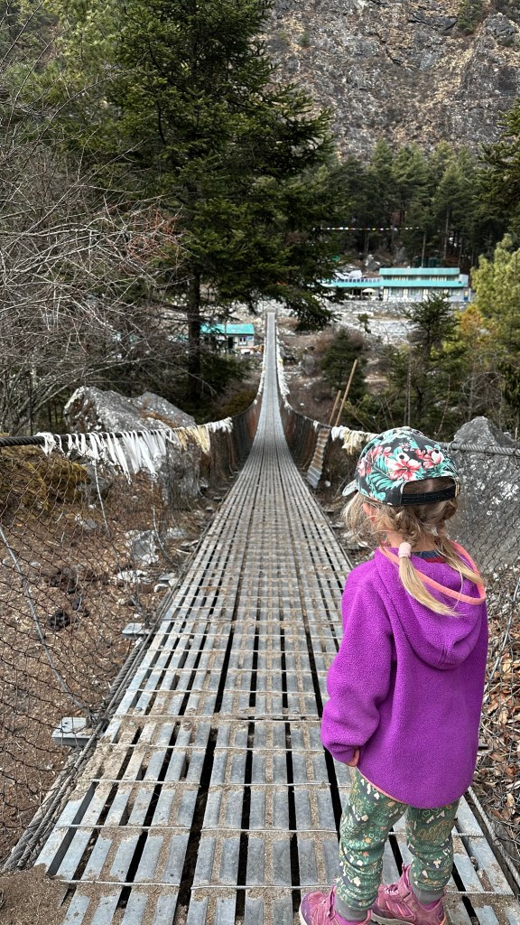 With our backpacks packed and the 3400NRs tab cleared up we started our way onto the suspension bridge by 9:40 and over the Dudh Kosi river one last time.