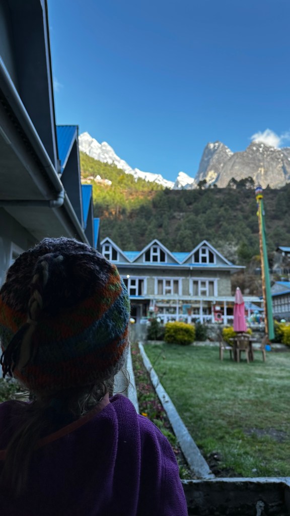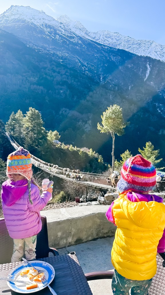 We gazed at the evergreen trees and glacial blue rivers as we crossed the prayer flag strewn suspension bridge and checked back into the Zambala Lodge just before 3:00. Our original plan was to push on a bit further and spend the night at the Ama Dublam Guest House but we did not think we could easily make it up the hill with the girls, just a bit to much for them we thought. We relaxed in the sun room with our feet up as our girls used their imaginations to occupy the afternoon away. By 5:00 the fire was burning and we relocated to the dining hall for some hot drinks and dal baht curry. The feeling of accomplishment was really starting to set in and the surrealness had taken over. By 8:00 we receded into our room just as the peaks were getting overtaken by darkness. I’m really going to miss these mountain views.